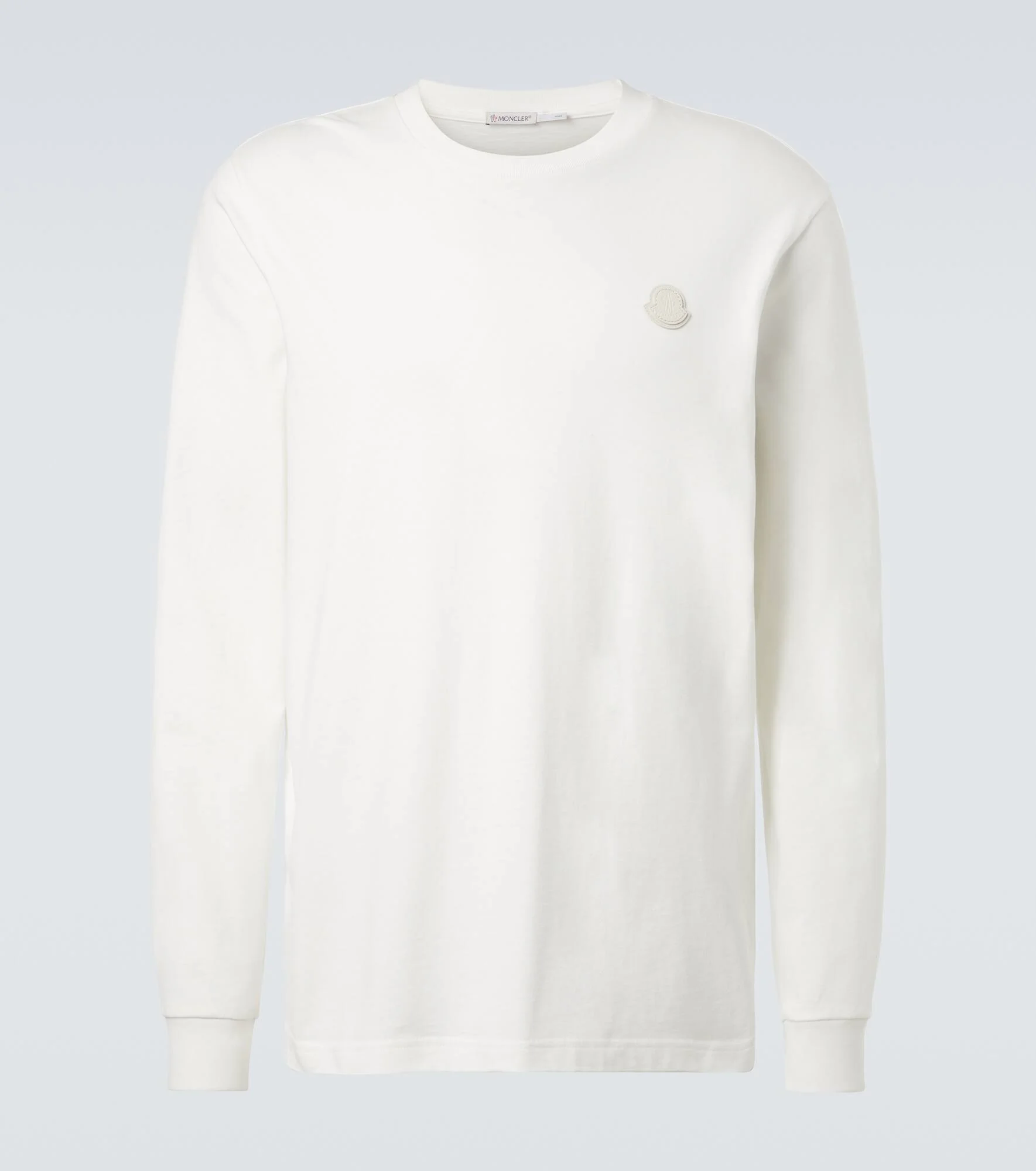 Bring a touch of luxury to your leisure edit with this long-sleeved T-shirt from Moncler. The white design is crafted from cotton jersey and topped with the brand's iconic logo in leather. Product Details - Material: 100% cotton - Care instructions: hand wash - Made in Italy - Designer color name: Silk White - Item color: white - Insert: 100% leather - Contains non-textile parts of animal origin - Cuff: ribbed - Hem: ribbed - Item number: P01088896