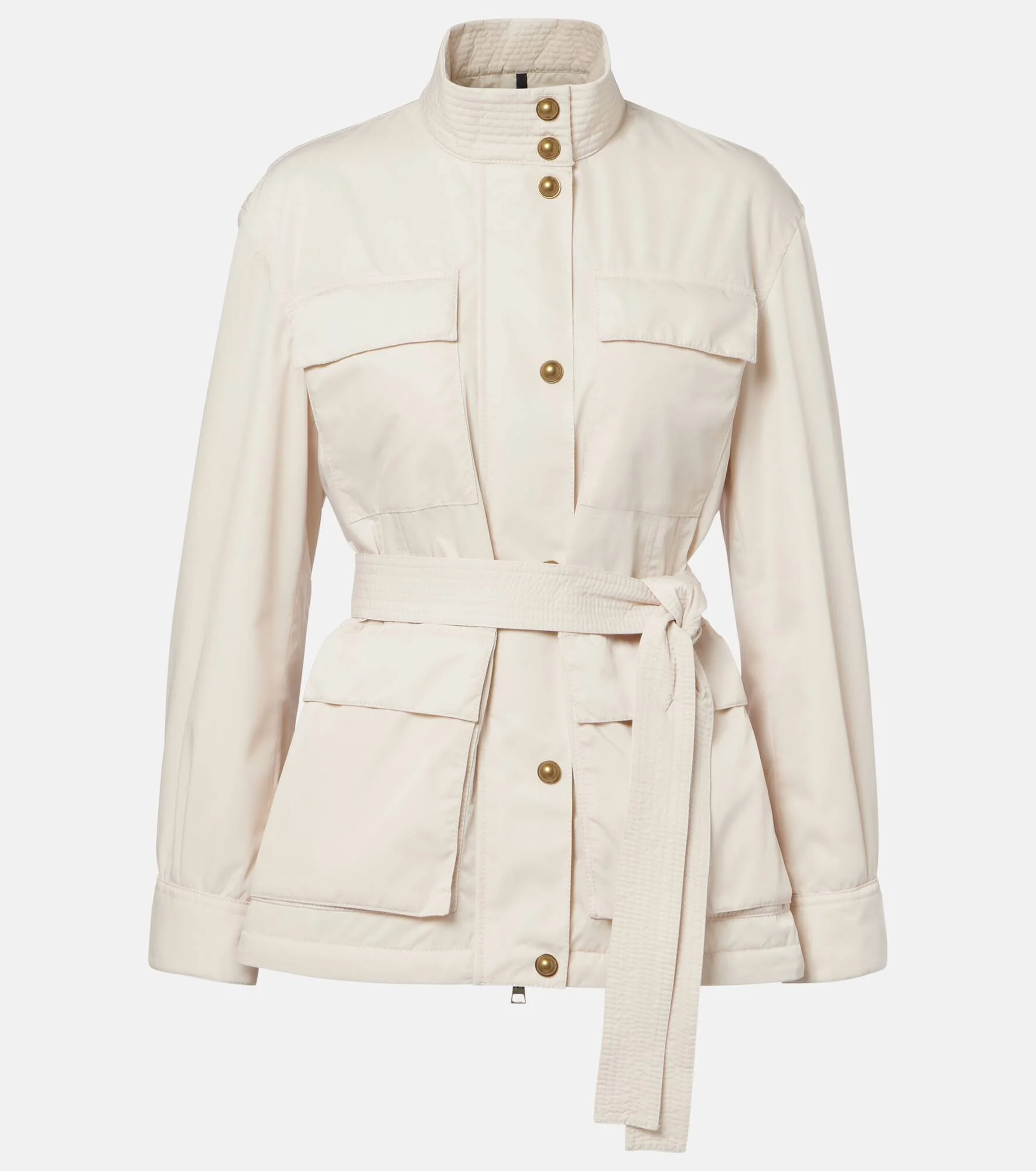 The Maitake jacket from Moncler features a belted waist and leather trims. The design has a high collar embellished with gold-tone buttons and practical front pockets for a utilitarian effect. Product Details - Material: 100% polyester - Care instructions: hand wash - Made in Romania - Color: white - Designer color name: 21F - Lining: 100% polyester - Filling: 100% polyester - Contains non-textile parts of animal origin - Details: 100% calf leather - Closure: two-way zipped front with snap-button fastenings - Pockets: snap-buttoned pockets - Detachable belt - Cuff: buttoned - Item number: P01127351 Size & Fit - True to size - Cinched waist - Adjustable at the waist - Non-stretchy fabric - Falls below the hip - The model seen in the picture is 178cm-5'10" and wearing a size 2