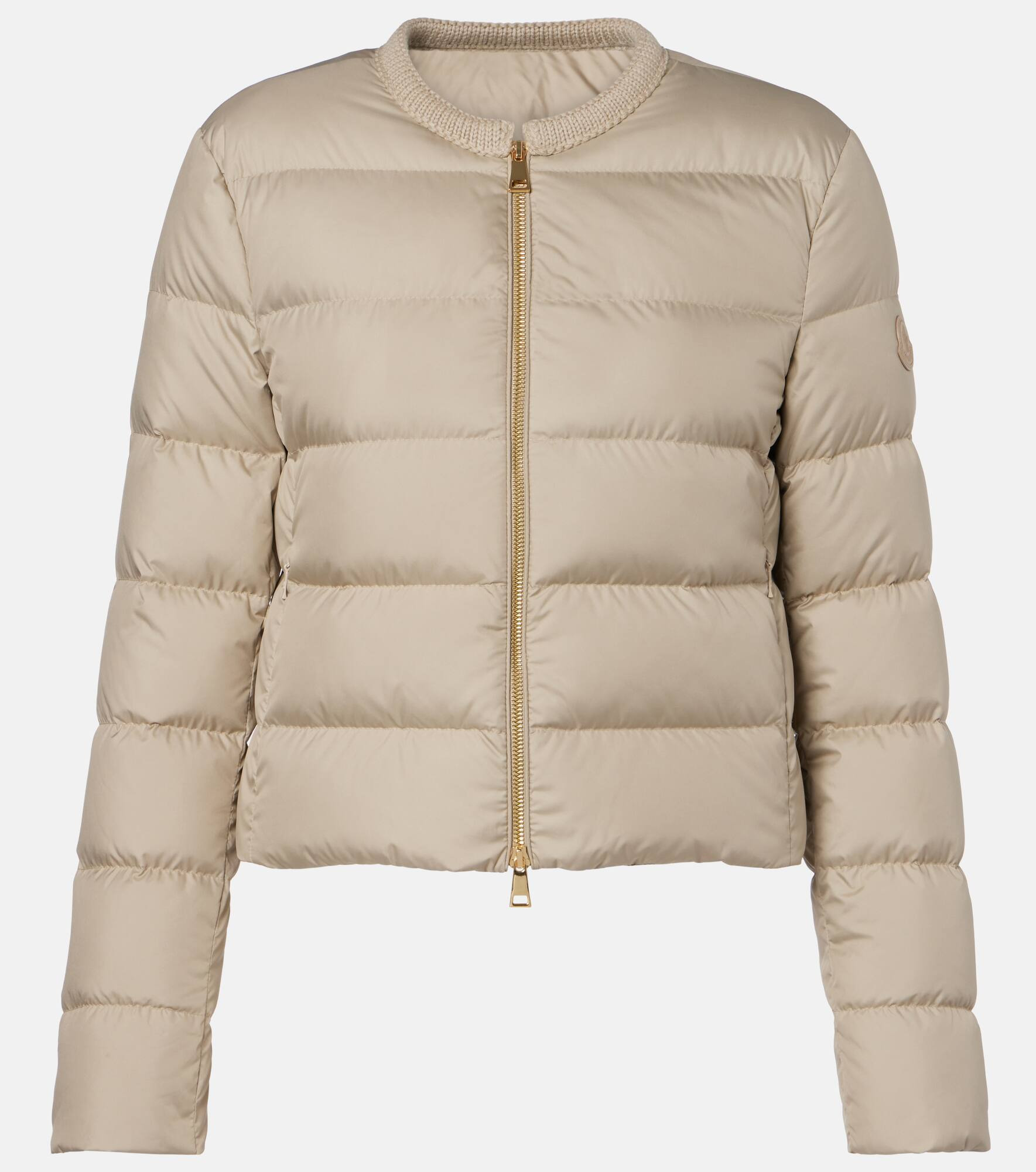 The Mauvezin jacket from Moncler has a chic and streamlined silhouette due to its collarless and cropped design. The piece is filled with DIST-certified down, sourced responsibly as a byproduct of the food industry. Product Details - Material: 100% polyester - Care instructions: hand wash - Made in Romania - Designer color name: Light Beige - Item color: beige - Details: 100% calf leather - Lining: 100% polyester - Filling: 90% down, 10% feathers - Contains non-textile parts of animal origin - Hardware color: gold - Closure: two-way zipped front - Collar: crewneck - Pockets: zipped pockets - Item number: P01068098 Size & Fit - Fits small to size - we recommend trying one size larger - Straight fit - Non-stretchy fabric - Falls to the hip - The model seen in the picture is 178cm-5'10" and wearing a size 1