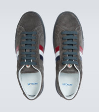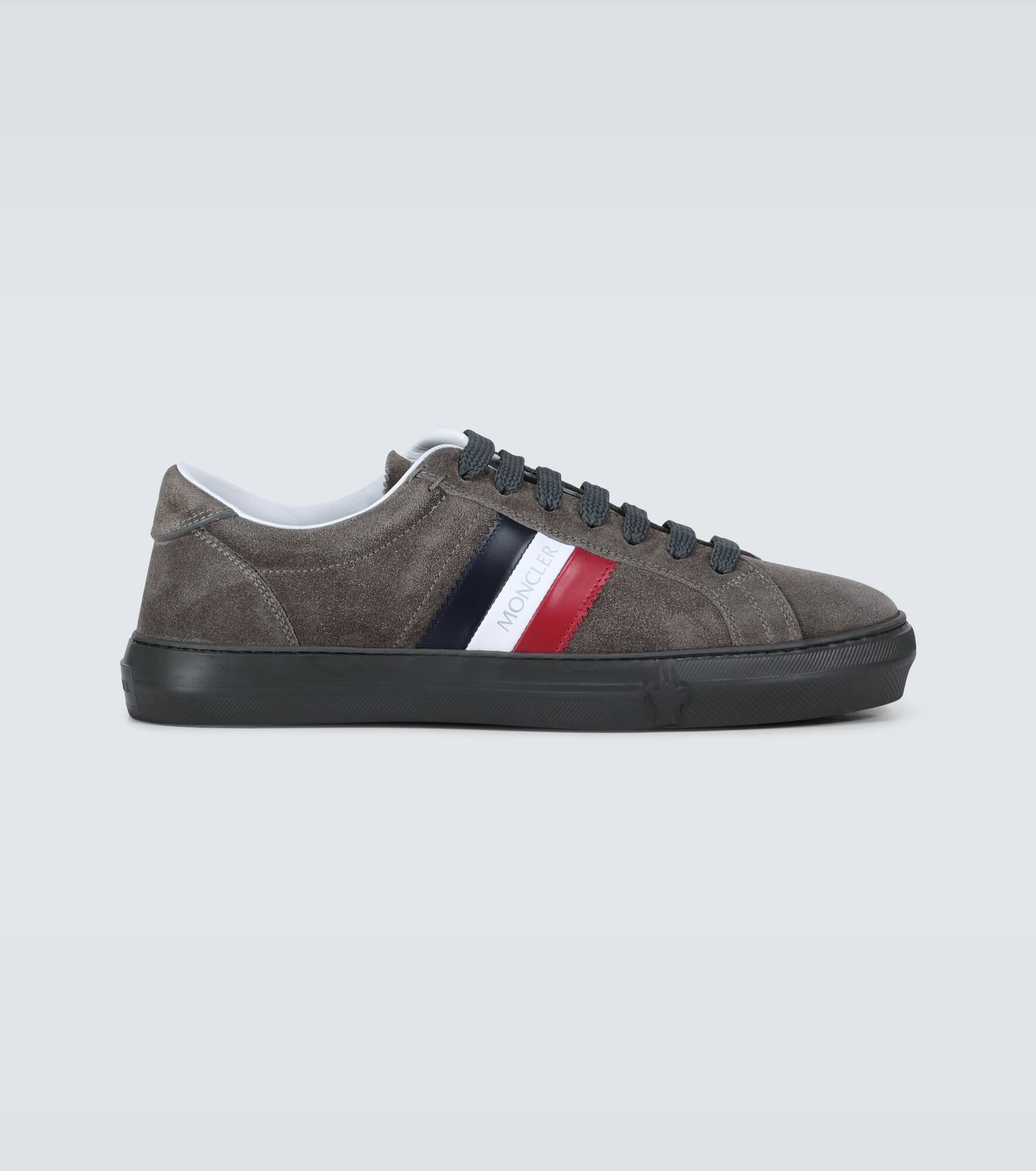 In a low-top silhouette, these suede sneakers from Moncler come in dark grey featuring tricolor stripes on both sides, atop a rubber sole. Product Details - Lining: leather - Sole: leather insole, rubber sole - Toe shape: round toe - Upper: leather - Closure: lace-up - Designer color name: Grey - Made in Italy - Item number: P00483632 Size & Fit - True to size - Half sizes please take the next size up - European sizes