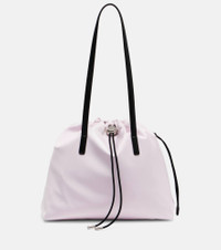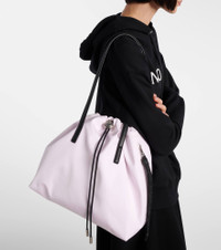 Crafted from a lightweight water-repellent fabric, the New Trick tote bag from Moncler features leather top handles and drawstring fastening. This design is finished with a zipped side pocket and an internal slot pocket. Product Details - Material: polyamide, polyester - Lining: nylon - Made in Italy - Designer color name: 500 - Item color: pink - Trim: calf leather - Top handles - Internal details: single compartment, internal slot pocket - Closure: drawstring top - Hardware color: silver - Contains non-textile parts of animal origin - Zipped side pocket - Item number: P01101510 Size & Fit - Height 28cm-11" - Width 32cm-12.5" - Depth 16cm-6.5" - Length of handles 70cm-27.5"