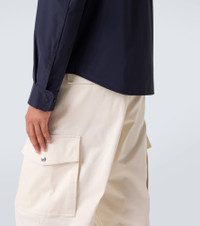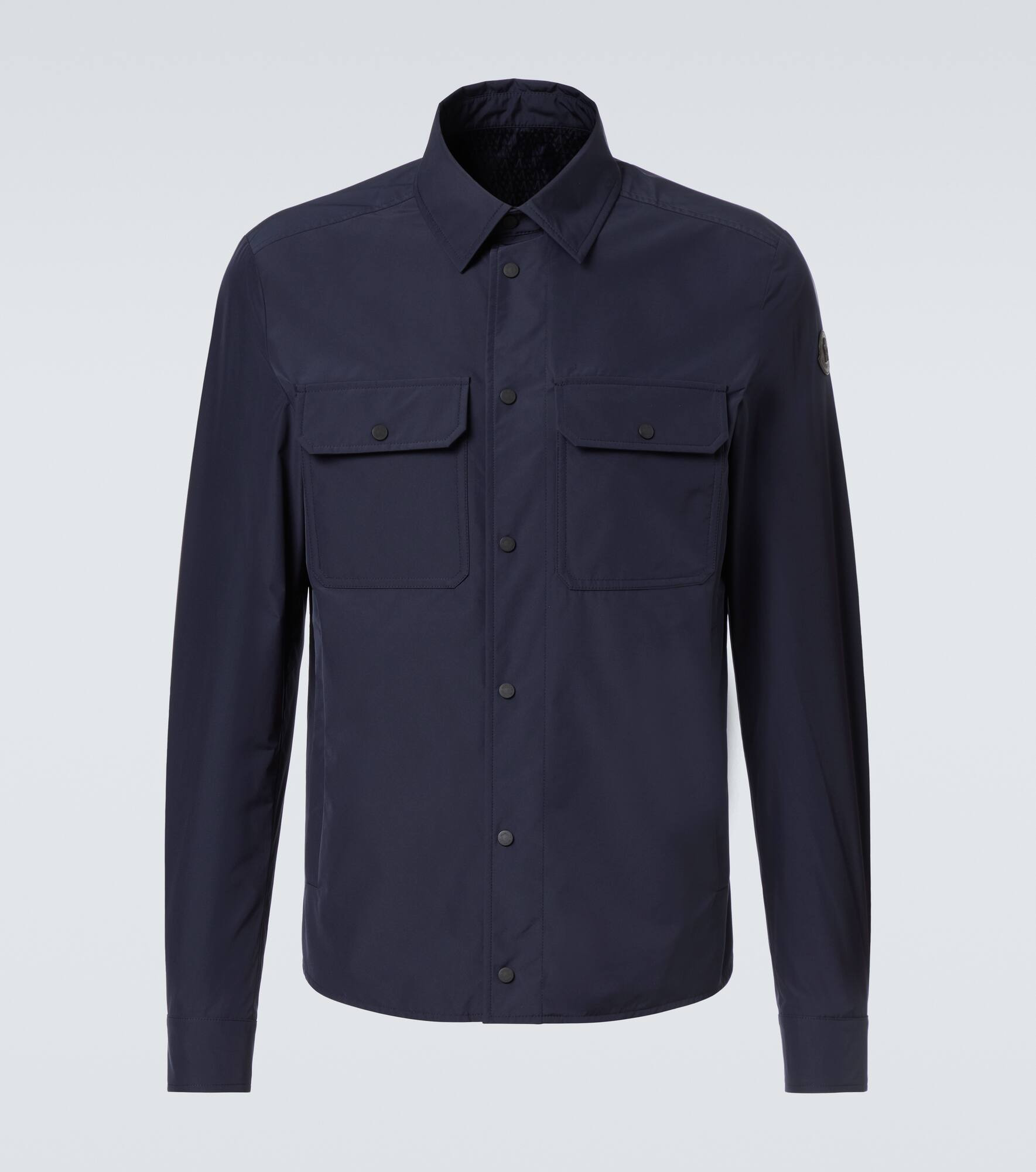 This poplin shirt from Moncler features two pockets on the front. Made in Italy, the piece has a center placket and a classic collar. Product Details - Material: 100% polyester - Care instructions: hand wash - Made in Italy - Designer color name: Navy Blue - Item color: blue - Details: 100% cow leather - Lining: 100% polyester - Lining II: 100% polyamide - Contains non-textile parts of animal origin - Closure: two-way zipped front with snap-button fastenings - Pockets: snap-buttoned pockets - Item number: P01068508 Size & Fit - True to size - Straight fit - Non-stretchy fabric - Falls to the hip - Height of model is 188cm-74" and wears a size L
