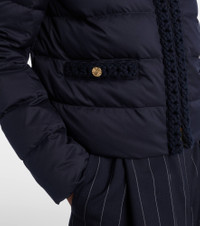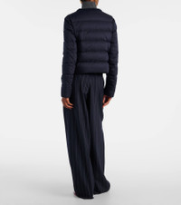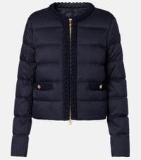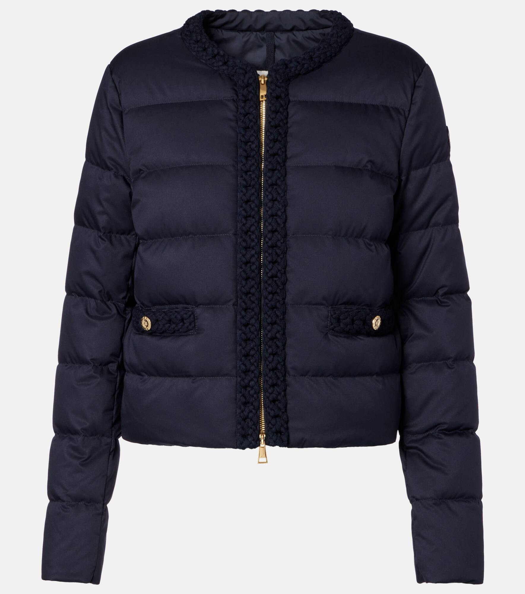 This jacket is quilted and down-padded for ultimate warmth and features tonal braided trims. Exclusively sourced from DIST-certified suppliers, all Moncler down is derived from farmed geese as a byproduct of the food industry. Product Details - Material: 100% polyester - Care instructions: dry clean - Made in Romania - Designer color name: Blue - Item color: blue - Details: 100% calf leather - Lining: 100% polyester - Filling: 90% down, 10% goose feathers - Contains non-textile parts of animal origin - Closure: two-way zipped front - Pockets: buttoned pockets - Hardware color: gold - Item number: P01068104 Size & Fit - Fits small to size - we recommend trying one size larger - Straight fit - Non-stretchy fabric - Slightly cropped - The model seen in the picture is 178cm-5'10" and wearing a size 1