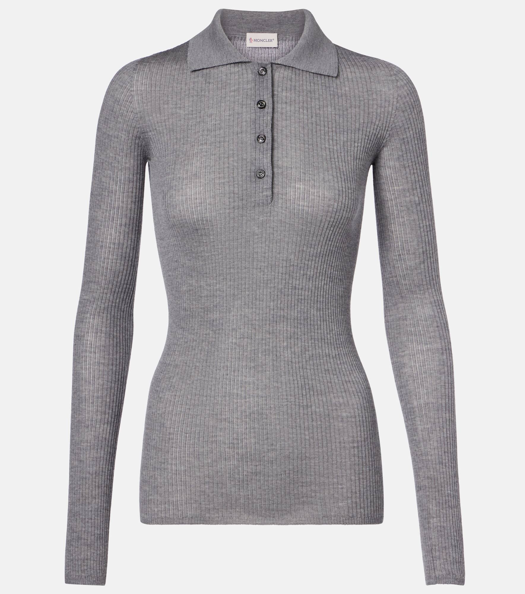 This polo shirt from Moncler is the perfect layering building block. Made from wool, the ribbed-knit style comes in a fitted silhouette and features a partially buttoned front. Product Details - Material: 100% wool - Care instructions: dry clean - Made in Italy - Designer color name: Grey - Item color: gray - Collar: polo collar - Closure: buttoned placket - French front (no front placket) - Item number: P01068123 Size & Fit - True to size - Fitted - Stretchy fabric - Falls to the hip - The model seen in the picture is 178cm-5'10" and wearing a size XS