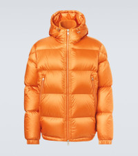 The Rivau jacket from Moncler showcases a shiny technical construction. Padded with insulating down, the design features a quilted finish, a logo patch on one sleeve, and a ribbed-knit collar alongside a protective hood. Product Details - Material: 100% polyamide - Care instructions: machine wash at 30 degrees - Made in Romania - Designer color name: Jaffa Orange - Item color: orange - Lining: 100% polyamide - Filling: 90% down, 10% goose feathers - Contains non-textile parts of animal origin - Hardware color: silver - Drawstring hood - Cuff: elasticated - Pockets: zipped pockets, internal pocket - Closure: two-way zipped front - Hem: elasticated - Item number: P01088872 Size & Fit - Fits small to size - we recommend trying one size larger - Straight fit - Elasticated hem - Non-stretchy fabric - Falls to the hip - Height of model is 189cm-74.5" and wears a size 4