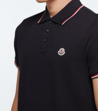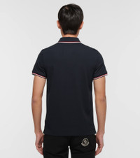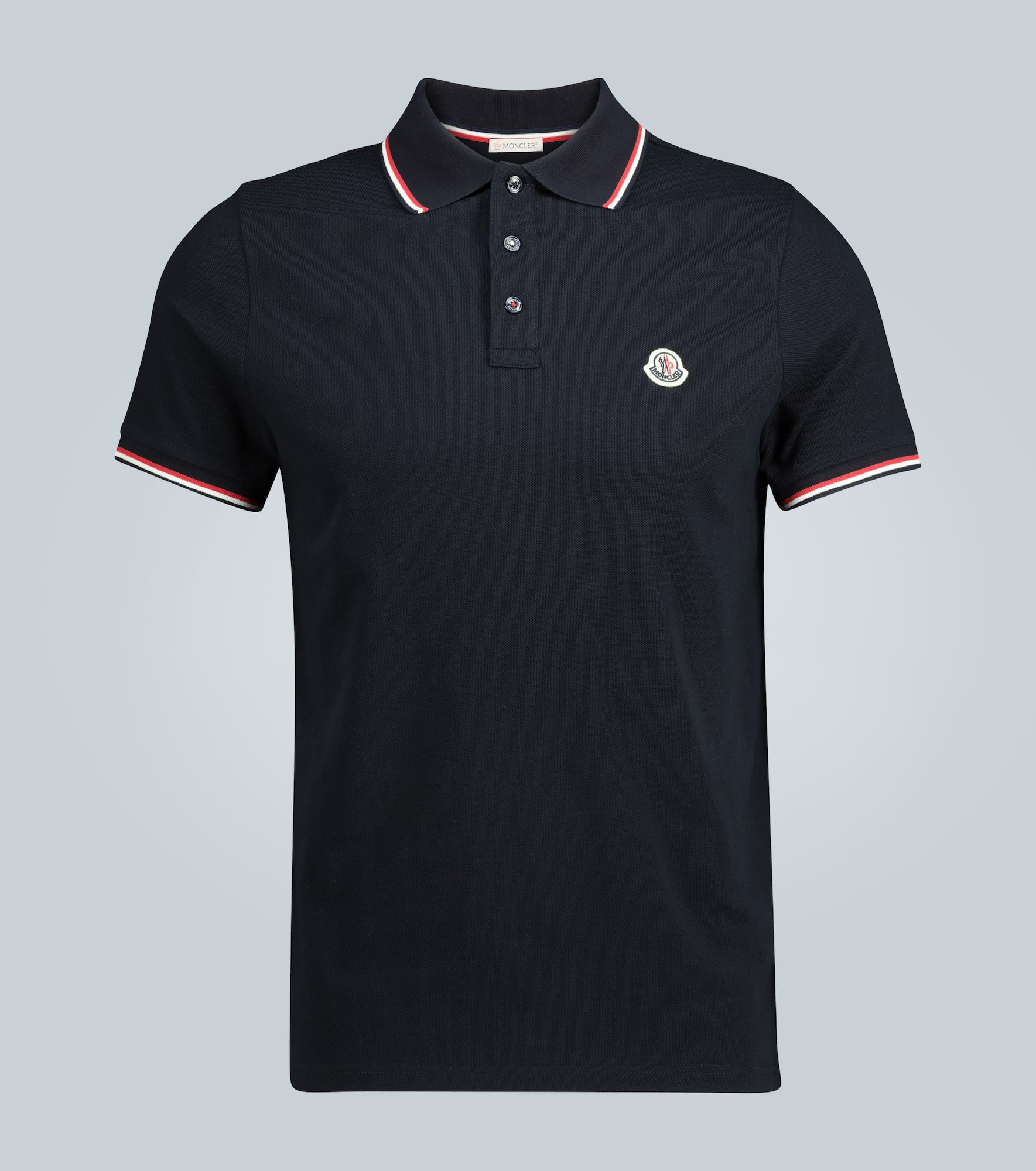 Made in a piqué knit from 100% cotton, this navy short-sleeve Polo shirt from Moncler features a three-button placket, complete with a logo patch, as well as red and white striped trims at the collar and sleeves. - material: 100% cotton - care instructions: machine wash at 30 degrees - partially buttoned front - Made in Turkey - Designer colour name: Navy - Runs small, please see Size & Fit tab
