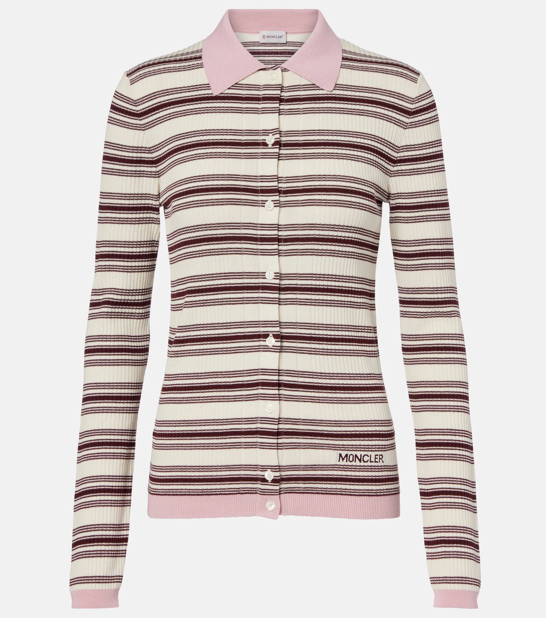 Reach for this Moncler polo shirt to build a playfully preppy ensemble. Made from pure cotton, the design features horizontal stripes and vertical ribbing alongside a front button placket and classic collar. Product Details - Material: 100% cotton - Care instructions: dry clean - Made in Romania - Color: multicoloured - Designer color name: F04 - Closure: partially buttoned front - Collar: polo collar - Item number: P01141809 Size & Fit - True to size - Cinched waist - Stretchy fabric - Falls to the hip - The model seen in the picture is 178cm-5'10" and wearing a size XS