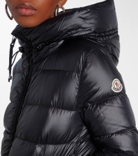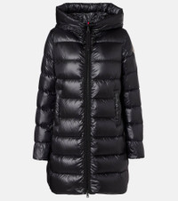Keep warm with the Suyen down coat, featuring a striped quilted pattern and a large hood. Exclusively sourced from DIST-certified suppliers, all Moncler down is derived from farmed geese as a byproduct of the food industry. Product Details - Material: 100% polyamide - Care instructions: hand wash - Made in Romania - Designer color name: Black - Item color: black - Lining: 100% polyamide - Lining II: 100% polyamide - Filling: 90% down, 10% feathers - Contains non-textile parts of animal origin - Closure: two-way zipped front - Drawstring hood - Pockets: snap-buttoned pockets - Cuff: elasticated - Item number: P01068161 Size & Fit - True to size - Designed for a loose fit - Non-stretchy fabric - The model seen in the picture is 178cm-5'10" and wearing a size 0