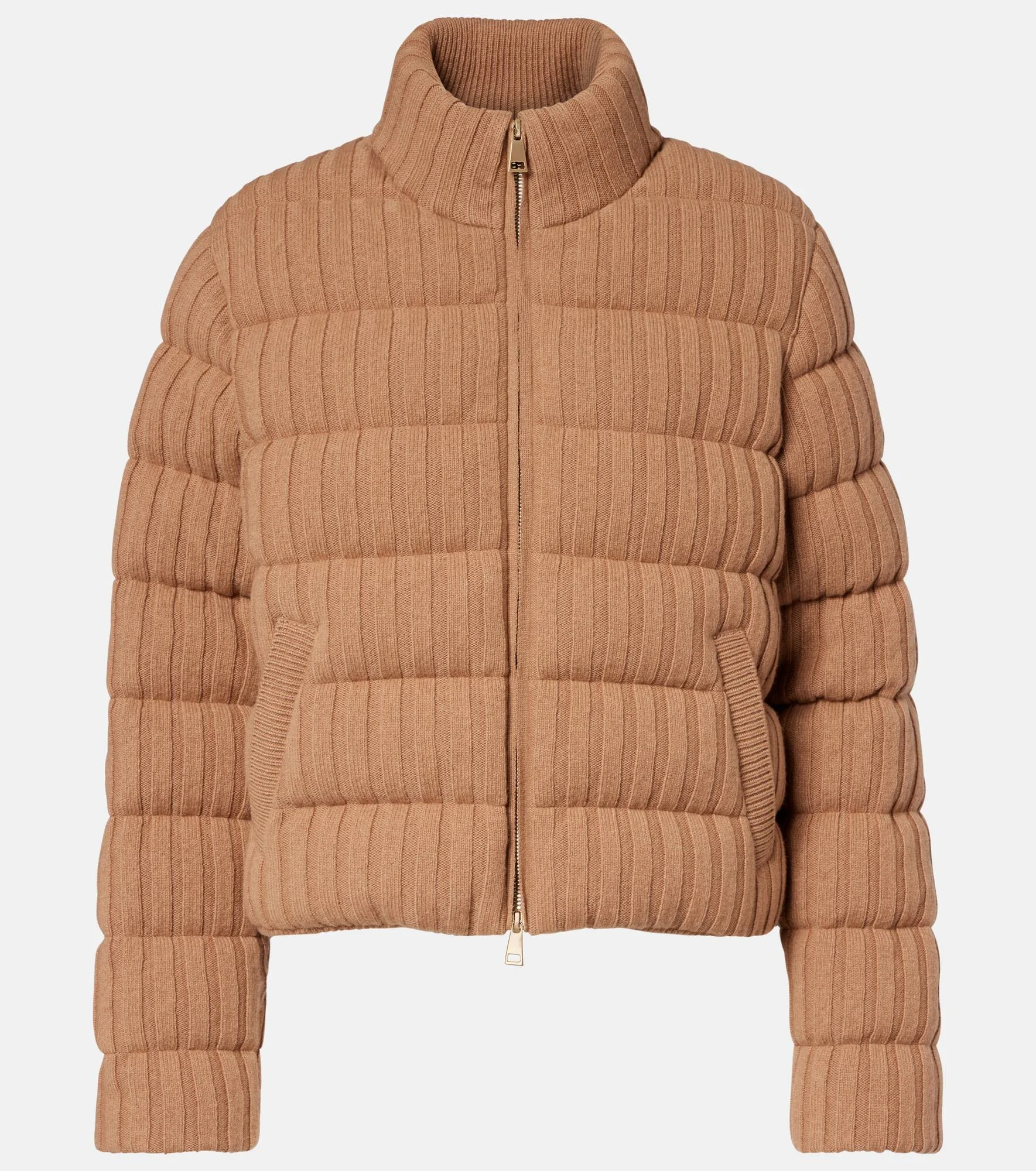 The warmth of wool and softness of cashmere collide into this plush down jacket by Moncler. Designed with a high neckline and a cropped silhouette, the brown style is lined with brand's signature Longue Saison fabric. Product Details - Material: 90% wool, 10% cashmere - Care instructions: dry clean - Made in Moldova - Color: brown - Designer color name: 22C - Lining: 100% polyamide - Filling: 90% down, 10% feathers - Contains non-textile parts of animal origin - Hardware color: gold - Closure: two-way zipped front - Pockets: welt pockets - Item number: P01127273 Size & Fit - True to size - Straight fit - Non-stretchy fabric - Slightly cropped - The model seen in the picture is 178cm-5'10" and wearing a size XS