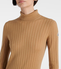 Lightweight but no less warm for it, this turtleneck sweater from Moncler is made from a blend of wool and cashmere. The design has a fitted silhouette and ribbed-knit construction. Product Details - Material: 90% wool, 10% cashmere - Care instructions: dry clean - Made in Romania - Designer color name: Beige - Item color: brown - Collar: turtleneck - Cuff: buttoned - Hem: ribbed - Item number: P01068080 Size & Fit - True to size - Fitted - Stretchy fabric - Falls to the hip - The model seen in the picture is 178cm-5'10" and wearing a size XS
