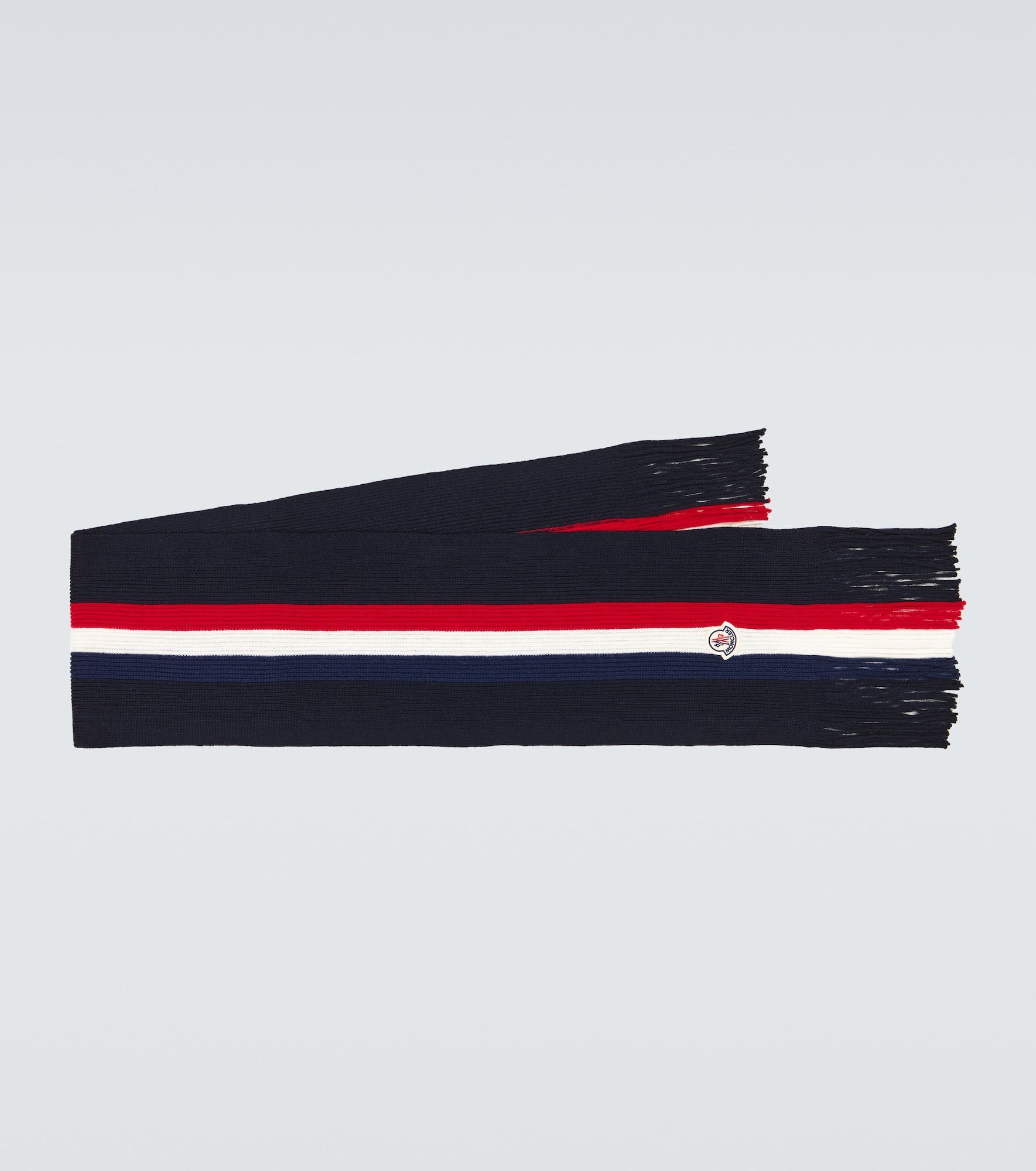 Knit from 100% wool in a blue ribbed design, this Moncler scarf features the label's tricolor stripe down the center, a logo patch and fringed edges. Product Details - Care instructions: dry clean - Material: 100% wool - Fringed ends - Made in Italy - Item number: P00484070 Size & Fit - Length 152cm-60" - Width 24cm-9.5" - Length of fringe 13cm-5"