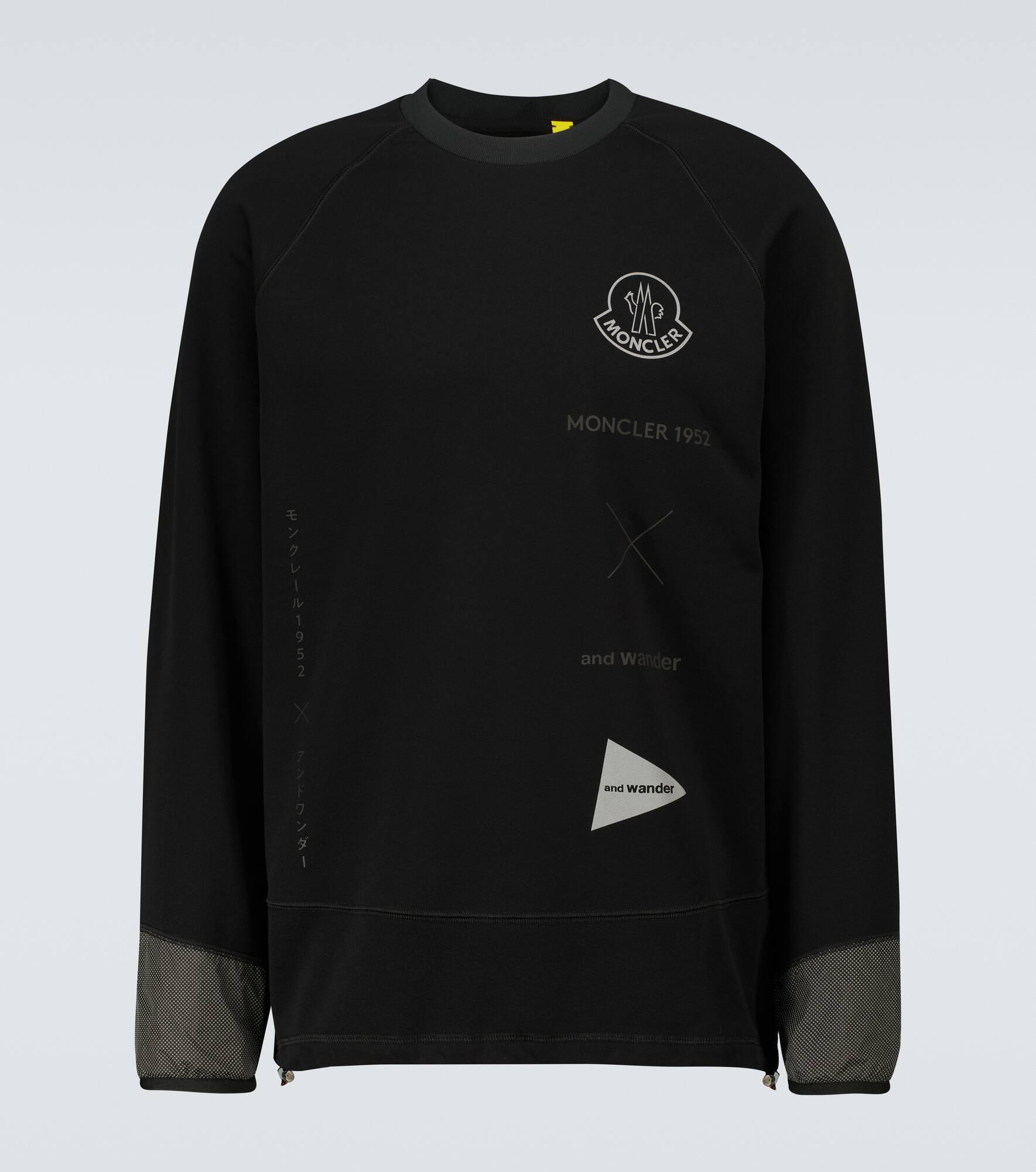 In collaboration with And Wander, this black crewneck sweatshirt from Moncler Genius' 2 Moncler 1952 line features branding from both labels, raglan-cut sleeves, and a drawstring hem. Product Details - Drawstring at the hem for adjustable fit - Care instructions: machine wash at 30 degrees - Designer color name: Black - Material II: 100% polyamide - Material: 57% polyester, 33% polyamide, 10% elastane - Item number: P00564004 Size & Fit - True to size - Designed for a loose fit - Mid-weight material - Falls below the hip - The model in the picture is 185cm-6'1" and wearing a size M