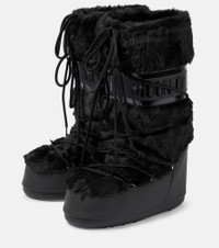 Lush faux fur trims bring extra coziness to these Moon Boots. Rendered in tone-on-tone black, the Icon boots feature classic brand hallmarks, including wrap-around adjustable ties and the label's logo embossed around the shafts. Product Details - Upper: fabric - Lining: fabric - Sole: fabric insole, rubber sole - Toe shape: round toe - Made in Romania - Includes: shoe box - Designer color name: Black - Item number: P00868084 Size & Fit - True to size - European sizes - 2,5cm-1" platform (size EU 38) - 4cm-1.5" wedge heel (size EU 38) - 30cm-12" shaft height (size EU 38) - 33cm-13" shaft width (size EU 38) - shaft width measured on largest part of boot - Size 35 = EU shoe size 35-37 - Size 39 = EU shoe size 38-40 - Size 42 = EU shoe size 41-42