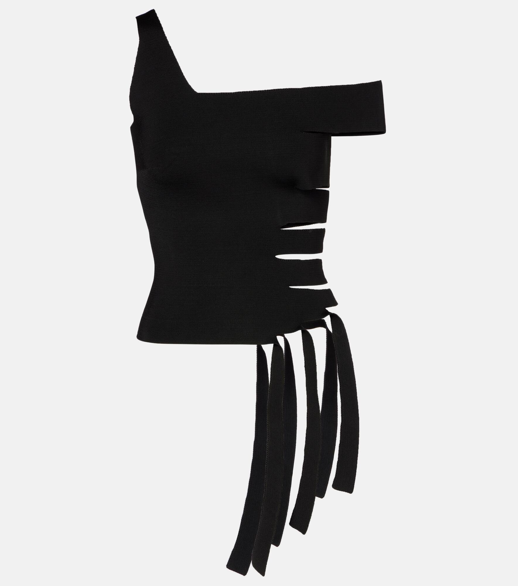 Best known for its sculptural silhouettes, the Parisian house of Mugler challenges conventional fashion design. The fitted top features asymmetrical shoulder straps and sharp cut-outs for a directional, body-framing effect. Product Details - Material: 72% viscose, 20% polyamide, 8% elastane - Care instructions: machine wash at 30 degrees - Made in Portugal - Designer color name: Black - Item color: black - Item number: P01060868 Size & Fit - Fits small to size - we recommend trying one size larger - Fitted - Slightly stretchy fabric - Cropped - The model seen in the picture is 178cm-5'10" and wearing a size S
