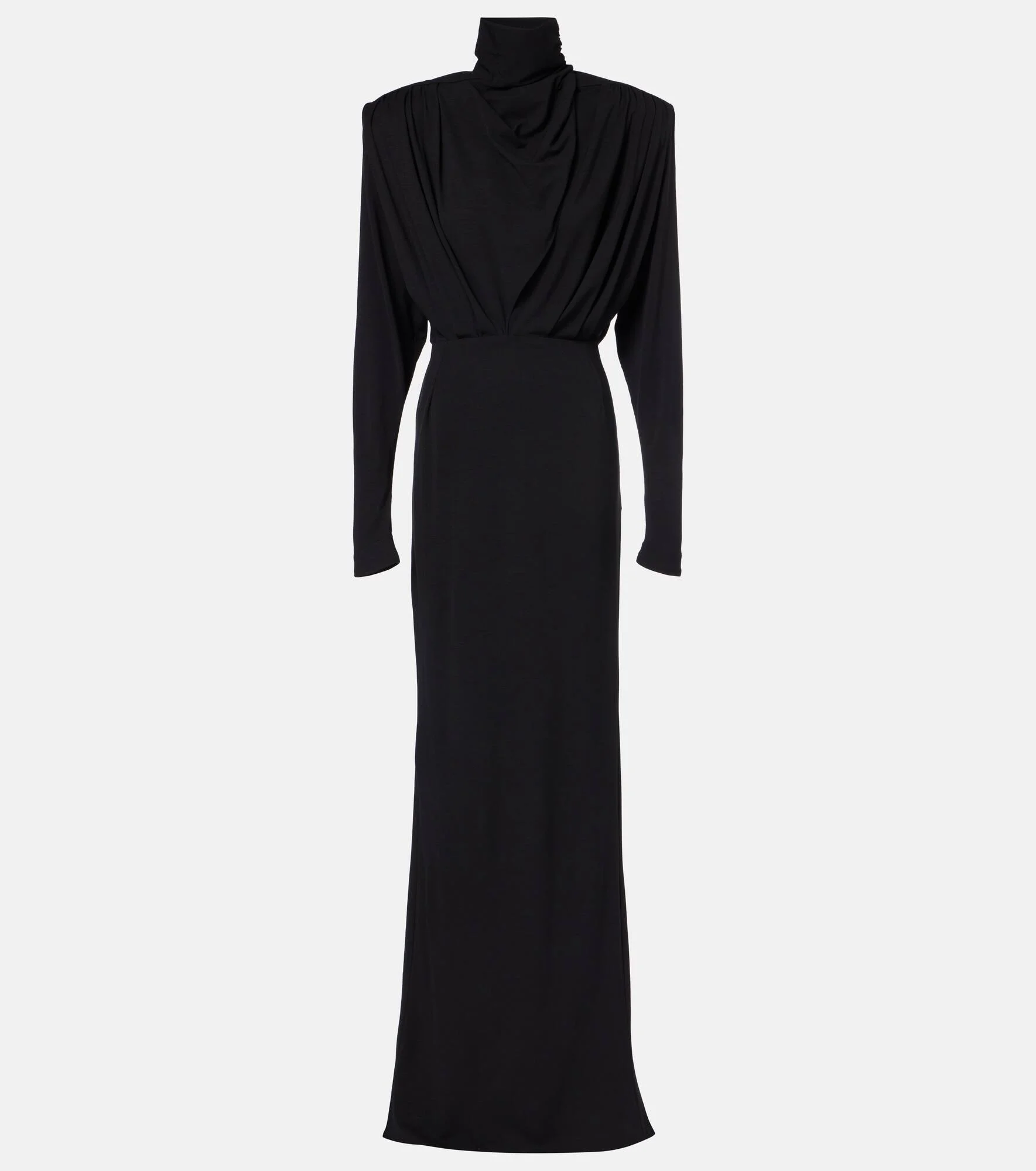 Best known for its sculptural silhouettes, the Parisian house of Mugler challenges conventional fashion design. This turtlemeck gown is crafted from jersey and features a draped bodice with structured shoulders for a dramatic look. Product Details - Material: 48% wool, 48% viscose, 4% elastane - Care instructions: hand wash - Made in Bulgaria - Color: black - Designer color name: Black - Closure: concealed zipped back - Shoulder pads - Item number: P01124987 Size & Fit - True to size - Oversized shoulders - Shoulder pad inserts - Low back - Cinched waist - Slightly stretchy fabric - The model seen in the picture is 178cm-5'10" and wearing a size FR 36
