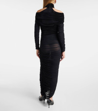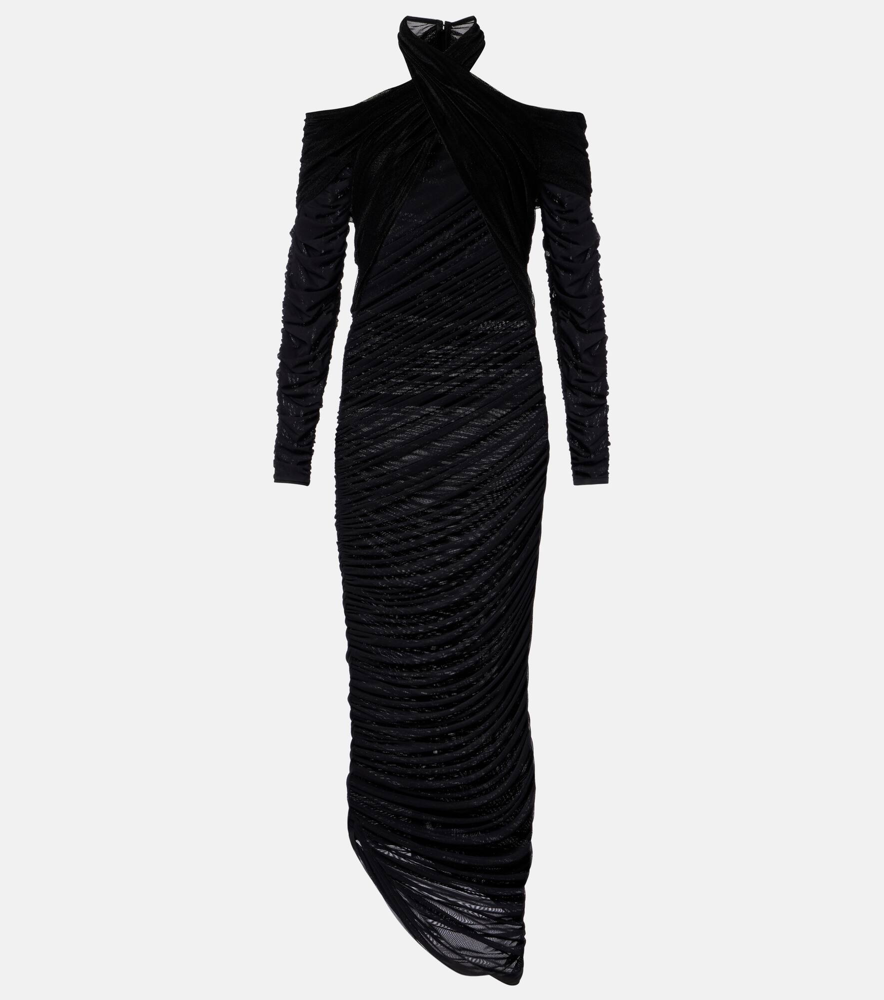 Best known for its sculptural silhouettes, the Parisian house of Mugler challenges conventional fashion design. This mesh maxi dress features a velvet halterneck overlay, an asymmetric hemline, and elegant draping with gathered detailing. Product Details - Material: 94% polyamide (recycled), 6% elastane (recycled) - Care instructions: dry clean - Made in Tunisia - Designer color name: Black - Item color: black - Material II: 57% polyester, 43% polyamide - Closure: invisible zipper - Item number: P01060861 Size & Fit - True to size - Semi-sheer - Fitted - Slightly stretchy fabric - The model seen in the picture is 178cm-5'10" and wearing a size FR 36