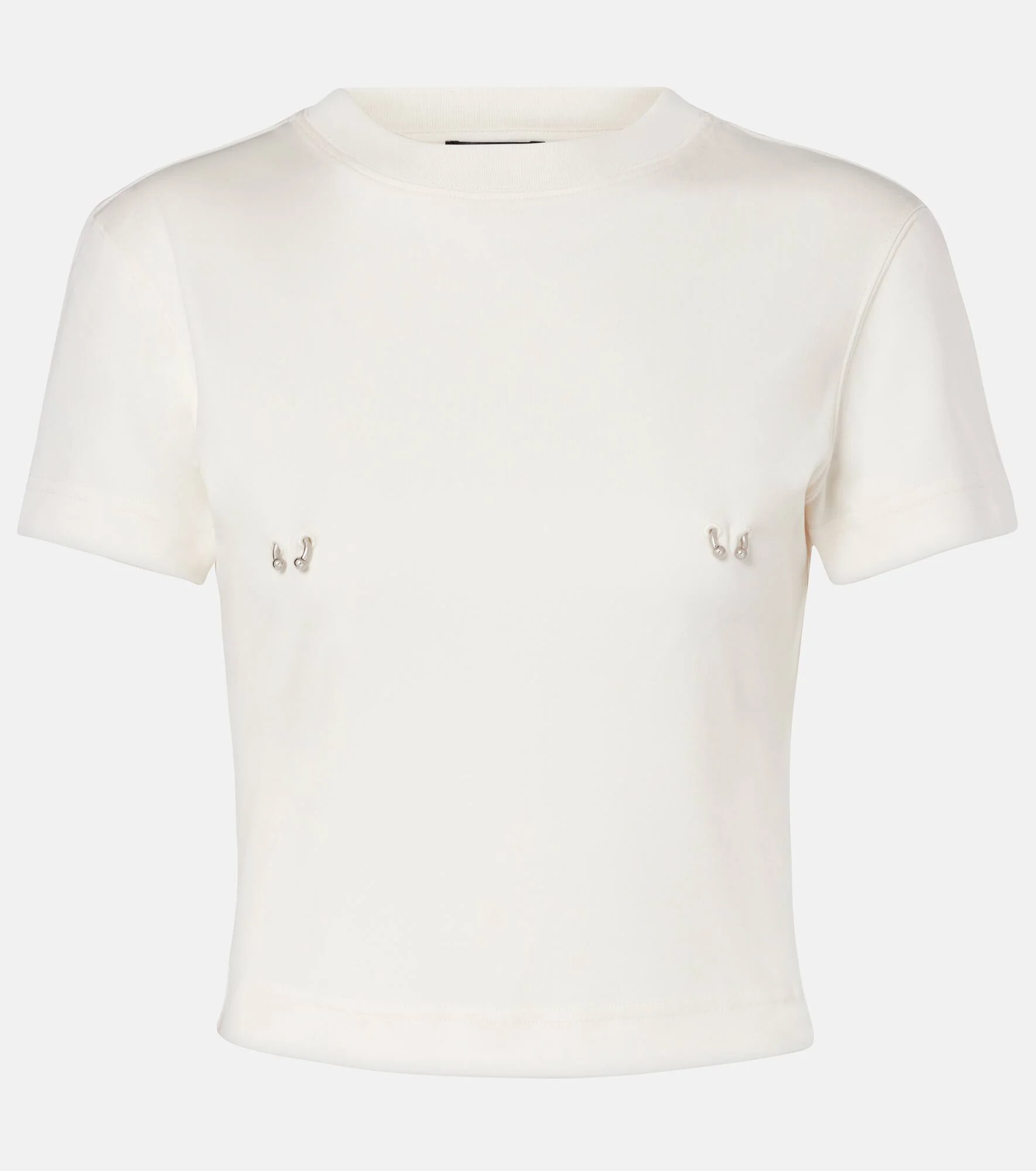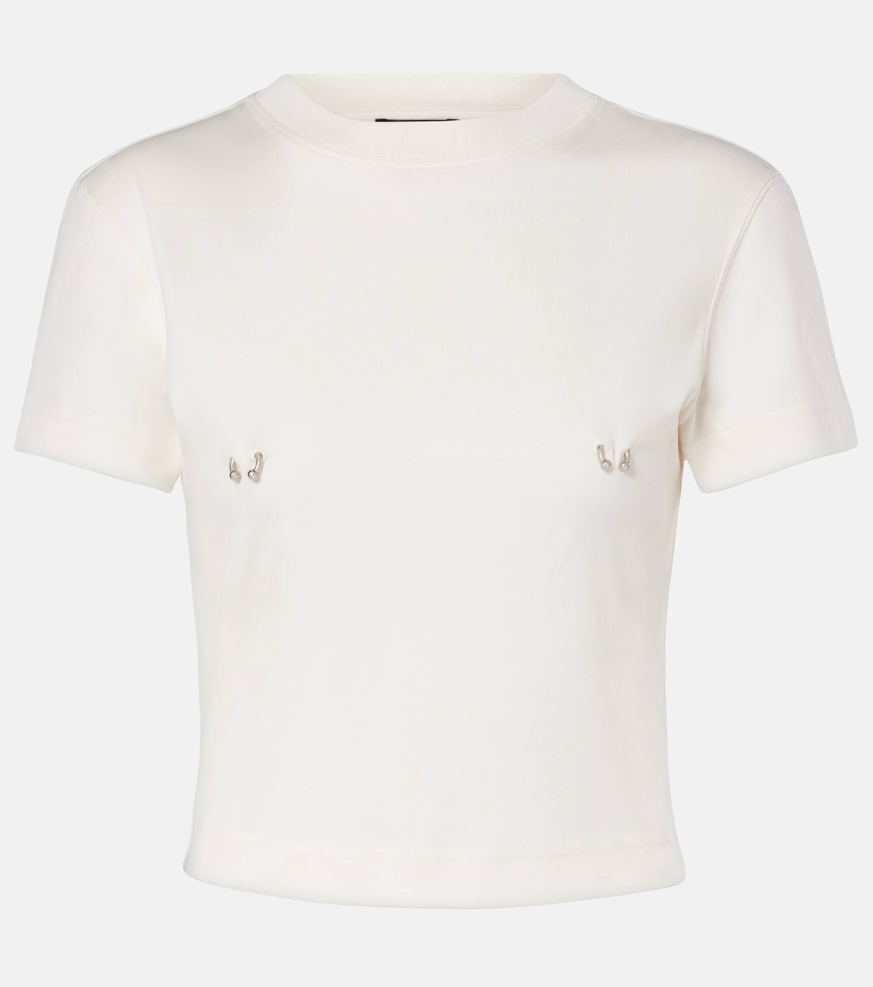 This T-shirt from Mugler is made from soft cotton jersey and cut to a slightly cropped silhouette. The crewneck style is detailed with silver piercings on the chest for an edgy touch. Product Details - Material: 100% cotton - Care instructions: machine wash at 30 degrees - Made in Portugal - Designer color name: Snow - Item color: white - Hardware color: silver - Collar: crewneck - Item number: P01060864 Size & Fit - True to size - Cinched waist - Slightly stretchy fabric - Cropped - The model seen in the picture is 178cm-5'10" and wearing a size XS