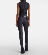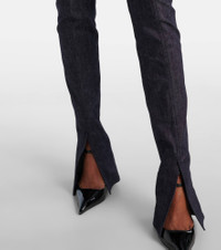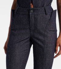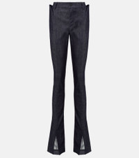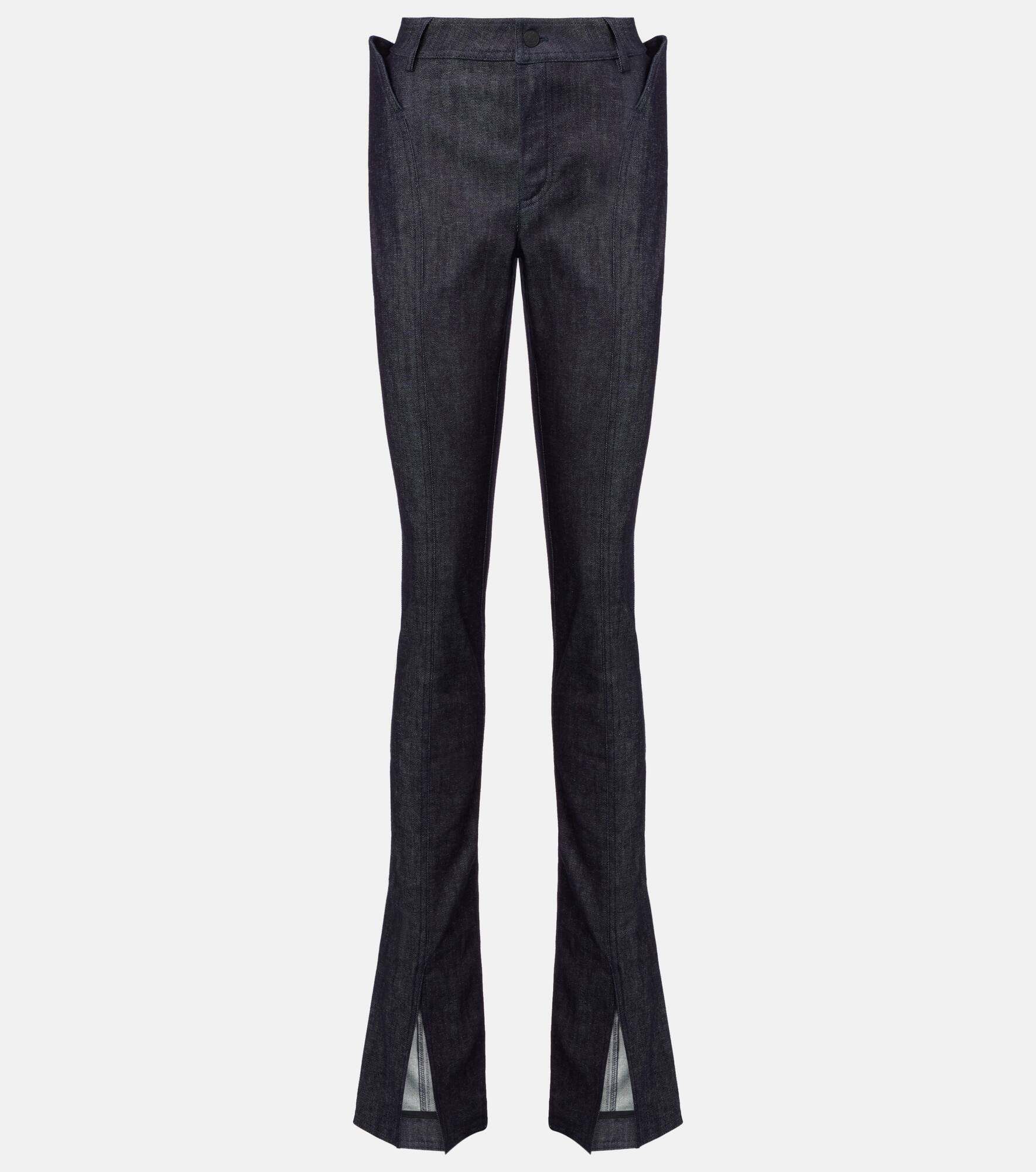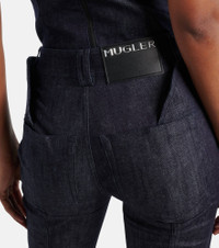 Best known for its sculptural silhouettes, the Parisian house of Mugler challenges conventional fashion design. These skinny jeans have protruding details at the hips and feature elongated ankle slits. Pair with the matching bodysuit. Product Details - Material: 98% cotton, 2% elastane - Care instructions: machine wash at 40 degrees - Made in Bulgaria - Designer color name: Raw Blue - Item color: blue - Closure: zip and button fastening - Pockets: side slit pockets, back pockets - Belt loops - Item number: P01028441 Size & Fit - Fits small to size - we recommend trying two sizes larger - Non-stretchy fabric - Slim-leg with a flared hem - High-rise - The model seen in the picture is 178cm-5'10" and wearing a size 29