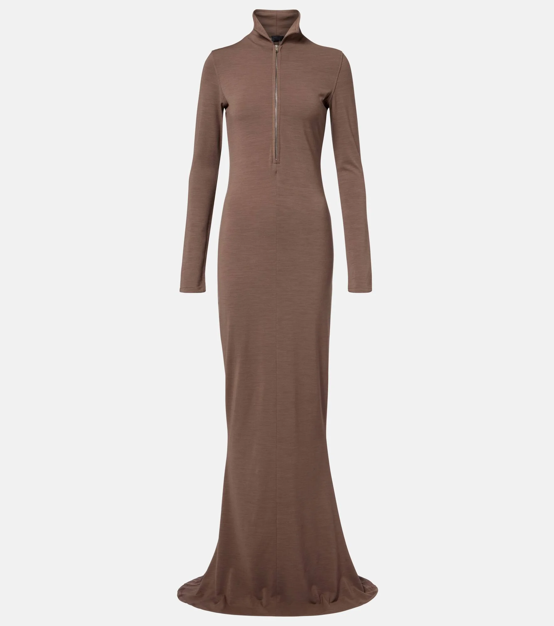 Best known for its sculptural silhouettes, the Parisian house of Mugler challenges conventional fashion design. Designed with a partially zipped front and long sleeves, this jersey gown blends timeless minimalism with modern detailing. Product Details - Material: 48% wool, 48% viscose, 4% elastane - Care instructions: hand wash - Made in Portugal - Color: brown - Designer color name: Mole - Closure: partially zipped front - Item number: P01124988 Size & Fit - True to size - Cinched waist - Stretchy fabric - The model seen in the picture is 178cm-5'10" and wearing a size FR 36