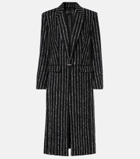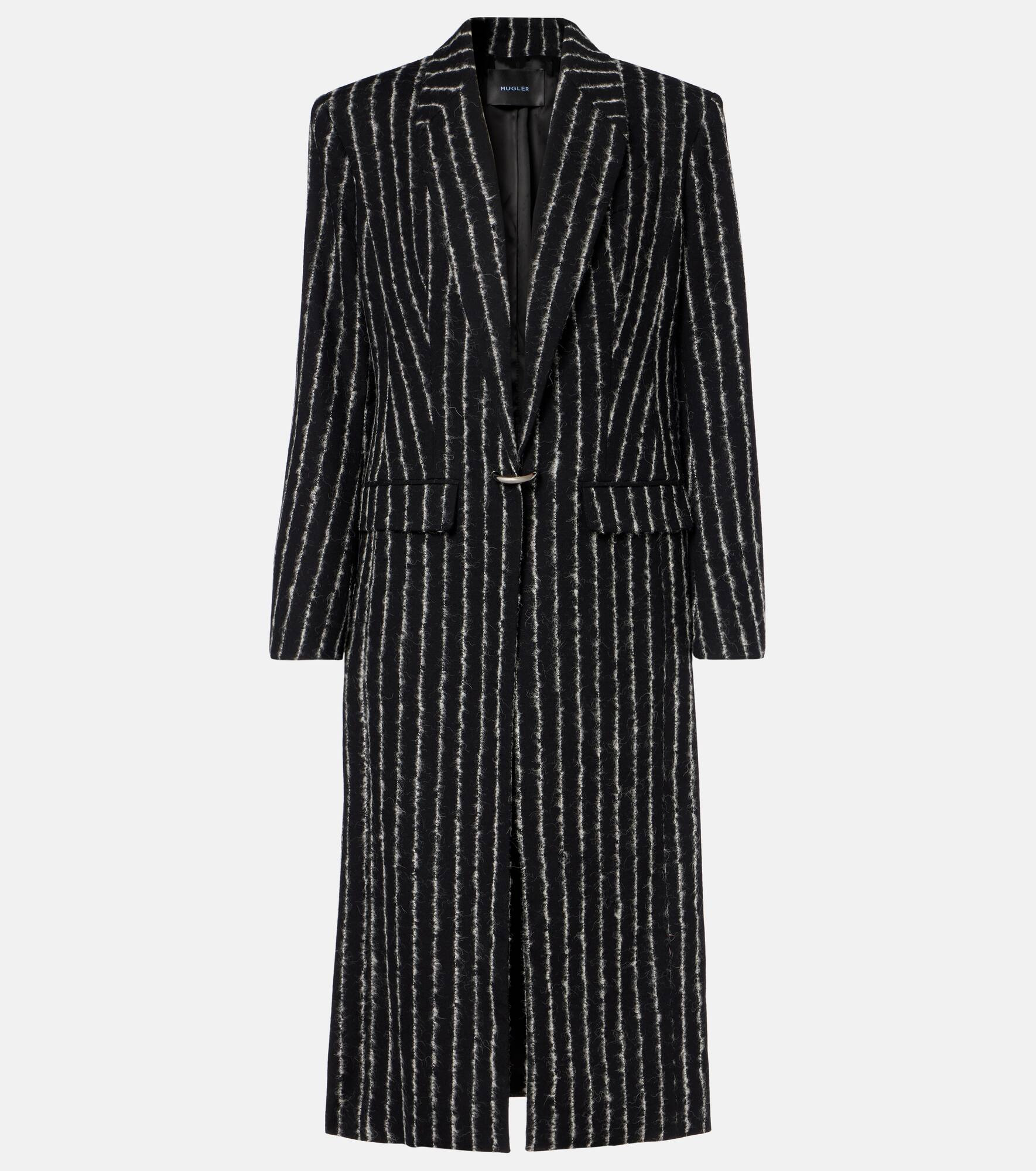 Best known for its sculptural silhouettes, the Parisian house of Mugler challenges conventional fashion design. This wool-blend coat is enriched with a pinstripe pattern, shoulder pads, and a silver-toned pierced metal closure for added allure. Product Details - Material: 96% wool, 2% elastane, 1% mohair, 1% alpaca wool - Care instructions: dry clean - Made in Morocco - Designer color name: Black / White - Item color: black, white - Lining: 100% cupro - Hardware color: silver - Notched lapel - Pockets: flap pockets - Long vent - Item number: P01060843 Size & Fit - True to size - Shoulder pad inserts - Straight fit - Non-stretchy fabric - The model seen in the picture is 178cm-5'10" and wearing a size FR 36