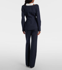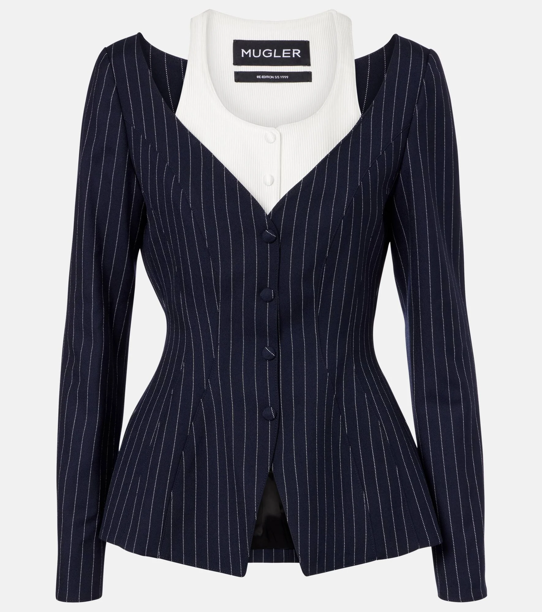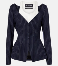 Best known for its sculptural silhouettes, the Parisian house of Mugler challenges conventional fashion design. The re/edit Les Salades jacket is a layered style, featuring a pinstriped wool jacket and ribbed-knit cotton-blend underlayer. Product Details - Material: 98% wool, 2% polyester - Care instructions: dry clean - Made in Ukraine - Designer color name: Navy /White - Item color: blue, white - Material II: 63% cotton, 37% viscose - Lining: 100% cupro - Closure: snap-buttoned front - Item number: P01104867 Size & Fit - True to size - Cinched waist - Non-stretchy fabric - Falls to the hip - The model seen in the picture is 178cm-5'10" and wearing a size FR 36