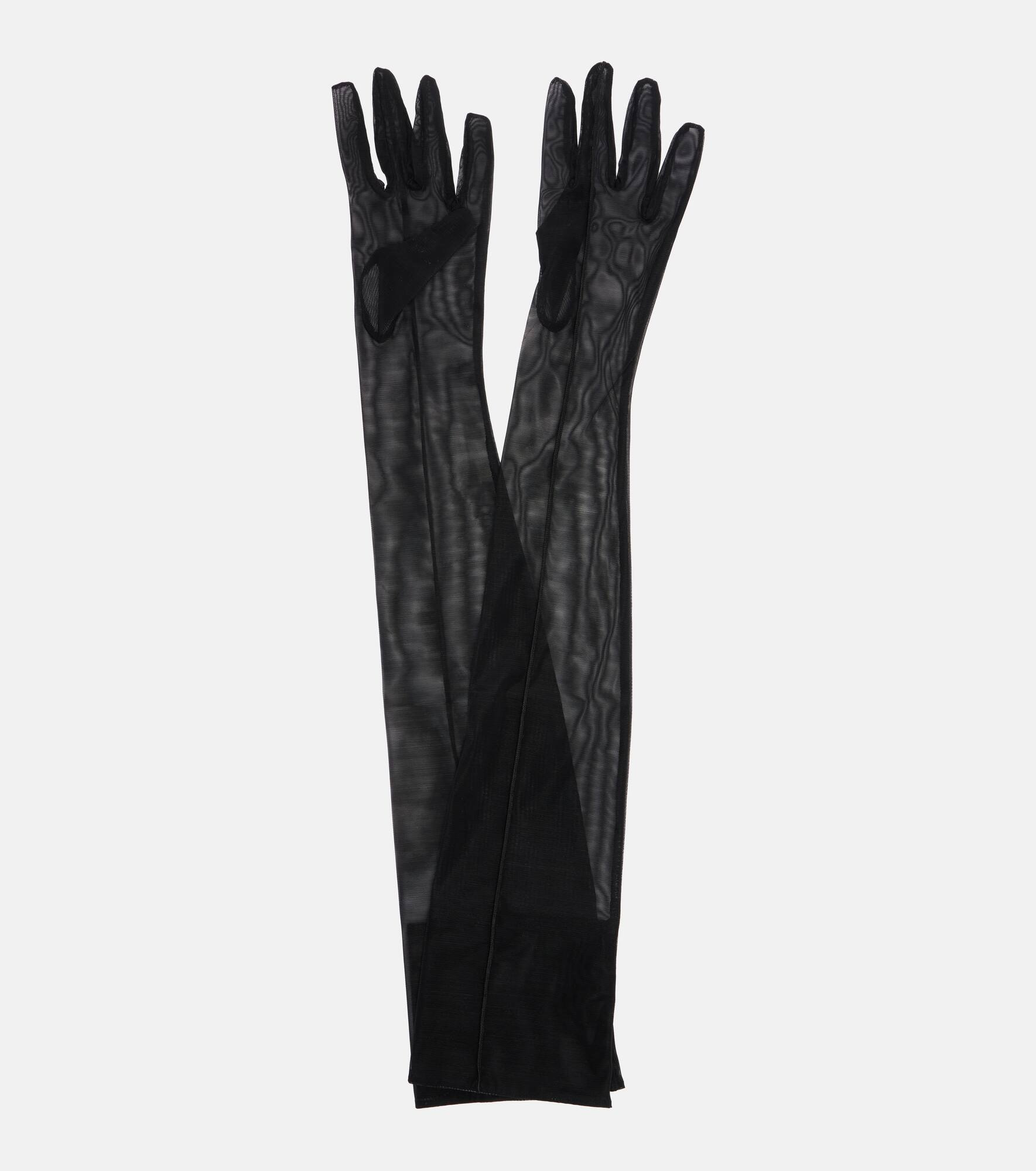 Best known for its sculptural designs, the Parisian house of Mugler challenges conventional fashion norms. Part of the re/edit capsule, these elegant gloves are crafted from sheer mesh into an opera-style silhouette. Product Details - Material: 83% polyamide, 17% elastane - Care instructions: machine wash at 40 degrees - Made in Tunisia - Designer color name: Black - Item color: black - Item number: P01104863 Size & Fit - Length 61cm-24" - Width of palm 8cm-3"