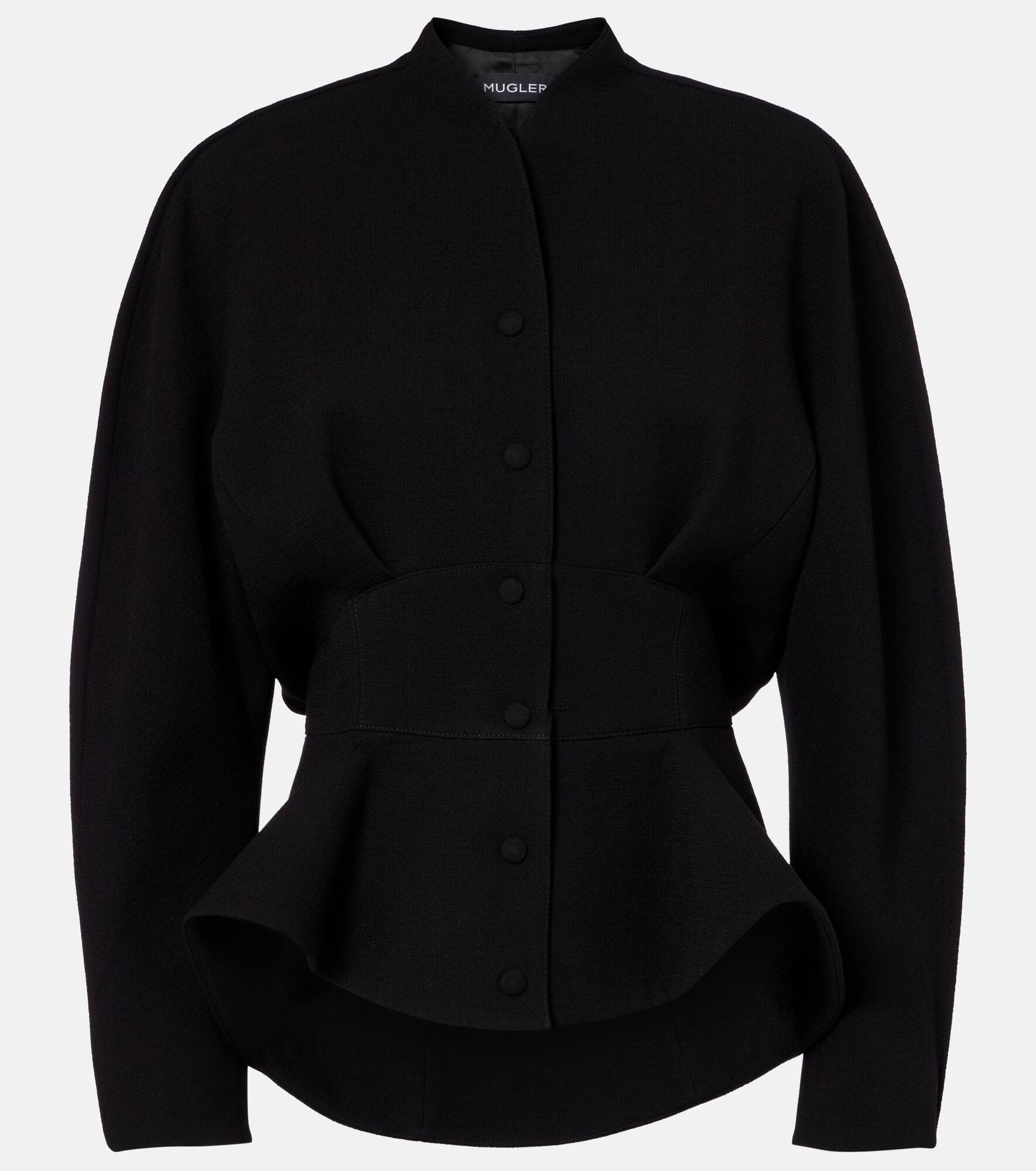 Mugler's re/edit capsule offers a reinterpretation of the house's signature archival pieces. Made from a heavy virgin wool fabric, this jacket is cut to a striking hourglass silhouette with padded shoulders and buttons along the front. Product Details - Material: 100% virgin wool - Care instructions: dry clean - Made in Ukraine - Designer color name: Black - Item color: black - Lining: 100% cupro - Closure: buttoned front - Item number: P01104870 Size & Fit - True to size - Shoulder pad inserts - Cinched waist - Non-stretchy fabric - Falls to the hip - The model seen in the picture is 178cm-5'10" and wearing a size FR 36