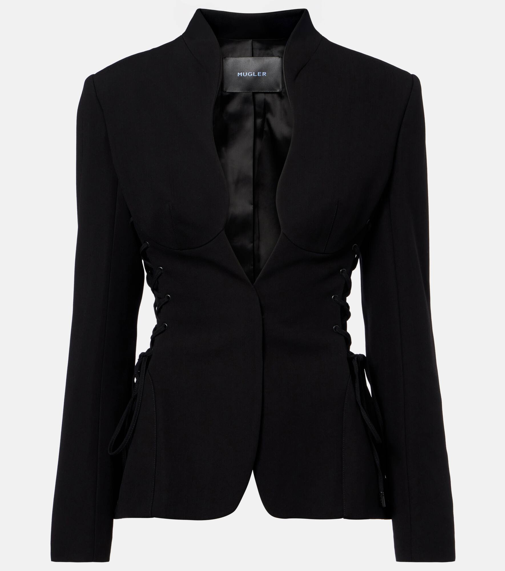 Best known for its sculptural silhouettes, the Parisian house of Mugler challenges conventional fashion design. This sophisticated, single-breasted blazer is defined by a deep V-neckline and lace detailing on the sides. Product Details - Material: 78% viscose, 22% wool - Care instructions: dry clean - Made in Bulgaria - Designer color name: Black - Item color: black - Lining: 100% cupro - Closure: buttoned front - Shoulder pads - Item number: P01060845 Size & Fit - True to size - Shoulder pad inserts - Cinched waist - Non-stretchy fabric - Falls to the hip - The model seen in the picture is 178cm-5'10" and wearing a size FR 36