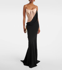 Product Details - Material: 100% polyester - Care instructions: do not wash - Made in Portugal - Designer color name: Black Nude 01 - Closure: self-ties, concealed zipper - Material II: 72% viscose, 28% silk - Material III: 100% polyamide - Item number: P01010829 Size & Fit - True to size - Low back - Strapless - Internal boned corset for support - Cinched waist - Non-stretchy fabric - The model seen in the picture is 178cm-5'10" and wearing a size FR 36