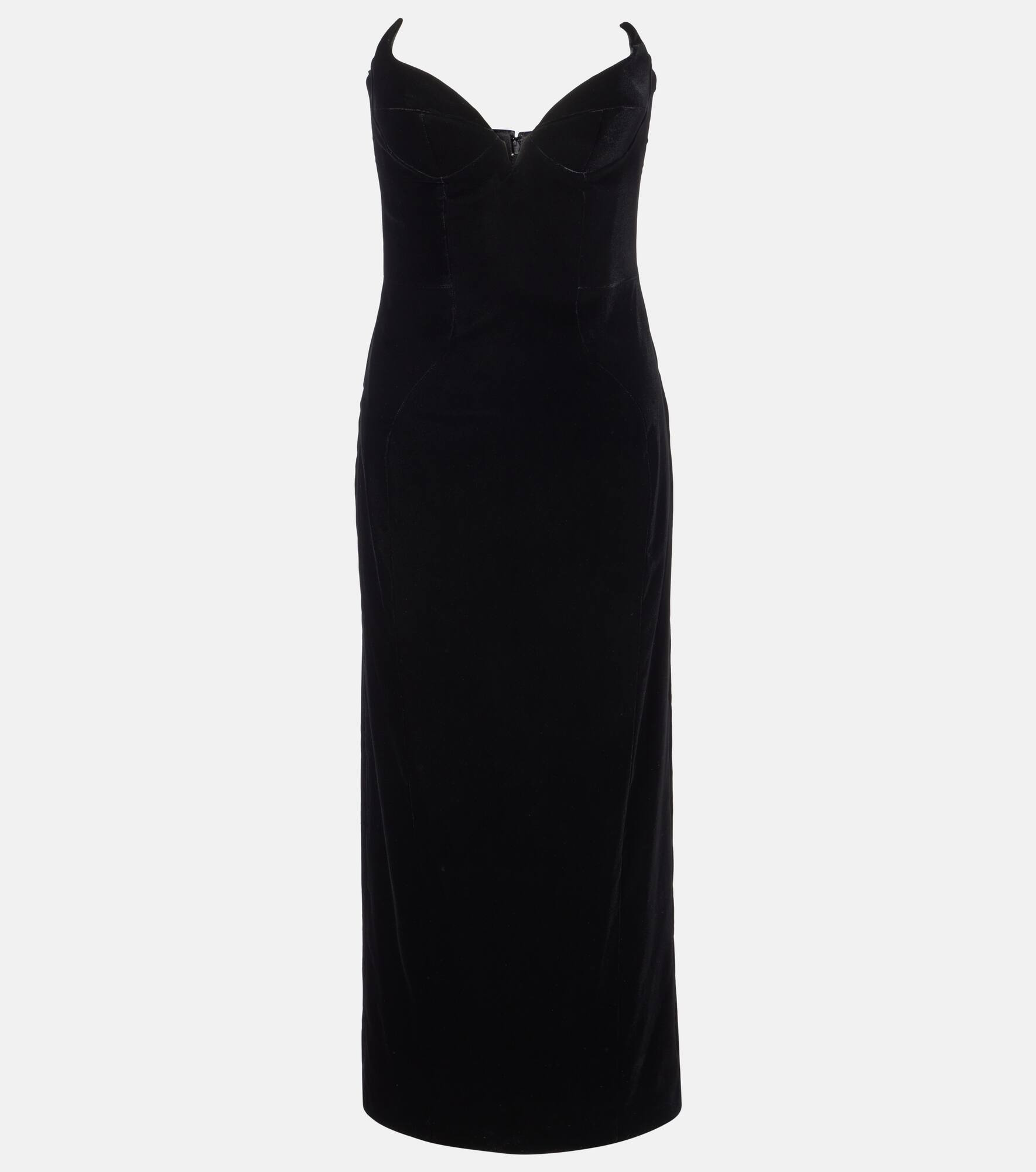 Best known for its sculptural silhouettes, the Parisian house of Mugler challenges conventional fashion design. This bustier dress has sculptural boning, velvet construction with internal satin lining, and spiked strapless design. Product Details - Material: 66% rayon, 32% cupro, 2% elastane - Care instructions: do not wash - Made in Bulgaria - Designer color name: Black - Item color: black - Material II: 78% silk, 22% polyester - Material III: 100% polyamide - Lining: 57% viscose, 43% elastodiene - Built-in bustier - Underwired cups - Closure: invisible zipper - Item number: P01060854 Size & Fit - True to size - Strapless - Internal corset with underwire support - Fitted - Non-stretchy fabric - Padded top - The model seen in the picture is 178cm-5'10" and wearing a size FR 36
