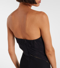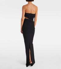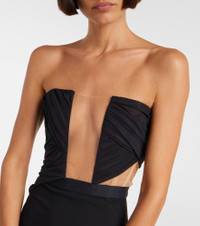 Alluring cutouts and intricate networks of straps have become synonymous with Nensi Dojaka's designs. This strapless gown features a sleek silhouette with sheer panels and zipped back closure. Product Details - Material: 83% viscose, 12% polyamide, 5% elastane - Care instructions: dry clean - Made in Italy - Designer color name: Black - Item color: black - Material II: 49% polyamide, 35% silk, 16% elastane - Closure: invisible zipper - Long vent - Boning - Item number: P01077606 Size & Fit - True to size - Strapless - Internal boned corset for support - Semi-sheer - Fitted - Partly stretchy fabric - The model seen in the picture is 178cm-5'10" and wearing a size XS
