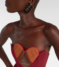 Alluring cutouts and intricate networks of straps have become synonymous with Nensi Dojaka's designs. This strapless gown is showcased in a deep burgundy and features an internal boned corset for added support. Product Details - Material: 83% viscose, 12% polyamide, 5% elastane - Care instructions: dry clean - Made in Italy - Designer color name: Burgundy - Item color: burgundy - Material II: 100% silk - Boning - Closure: invisible zipper - Long vent - Item number: P01077608 Size & Fit - True to size - Strapless - Internal boned corset for support - Fitted - Stretchy fabric - The model seen in the picture is 178cm-5'10" and wearing a size XS