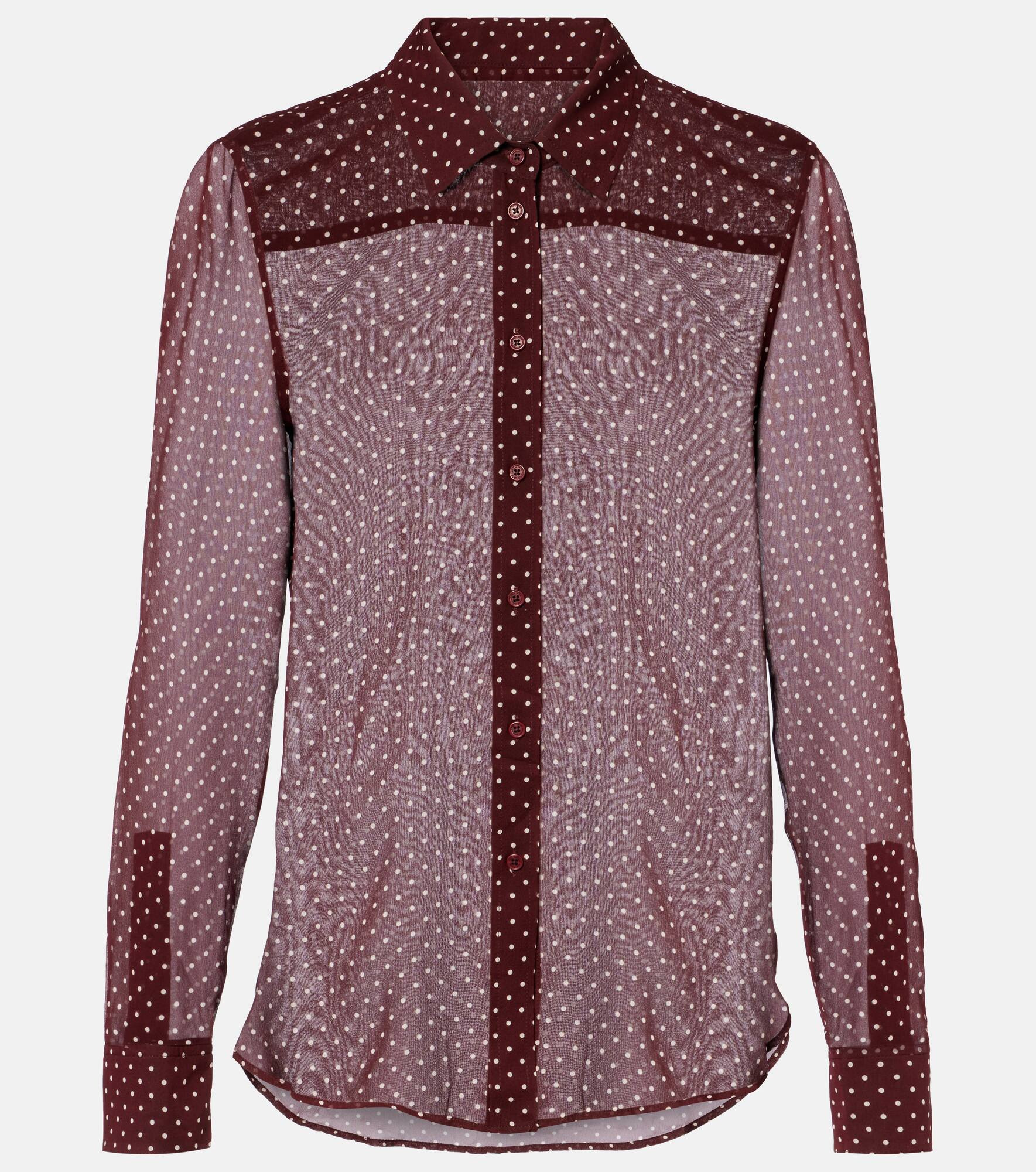 Invest in Nili Lotan's timeless wardrobe staples – where impeccable fit meets sophisticated tailoring. The Gaia shirt is crafted from pure silk with all-over polka-dots into a straight silhouette. Product Details - Material: 100% silk - Care instructions: dry clean - Made in the USA - Designer color name: Bordeaux/Cream Dots - Item color: burgundy, white - Collar: classic (Straight point) - Closure: buttoned front - Cuff: buttoned - Item number: P01076311 Size & Fit - True to size - Semi-sheer - Straight fit - Non-stretchy fabric - Falls below the hip - The model seen in the picture is 178cm-5'10" and wearing a size XS