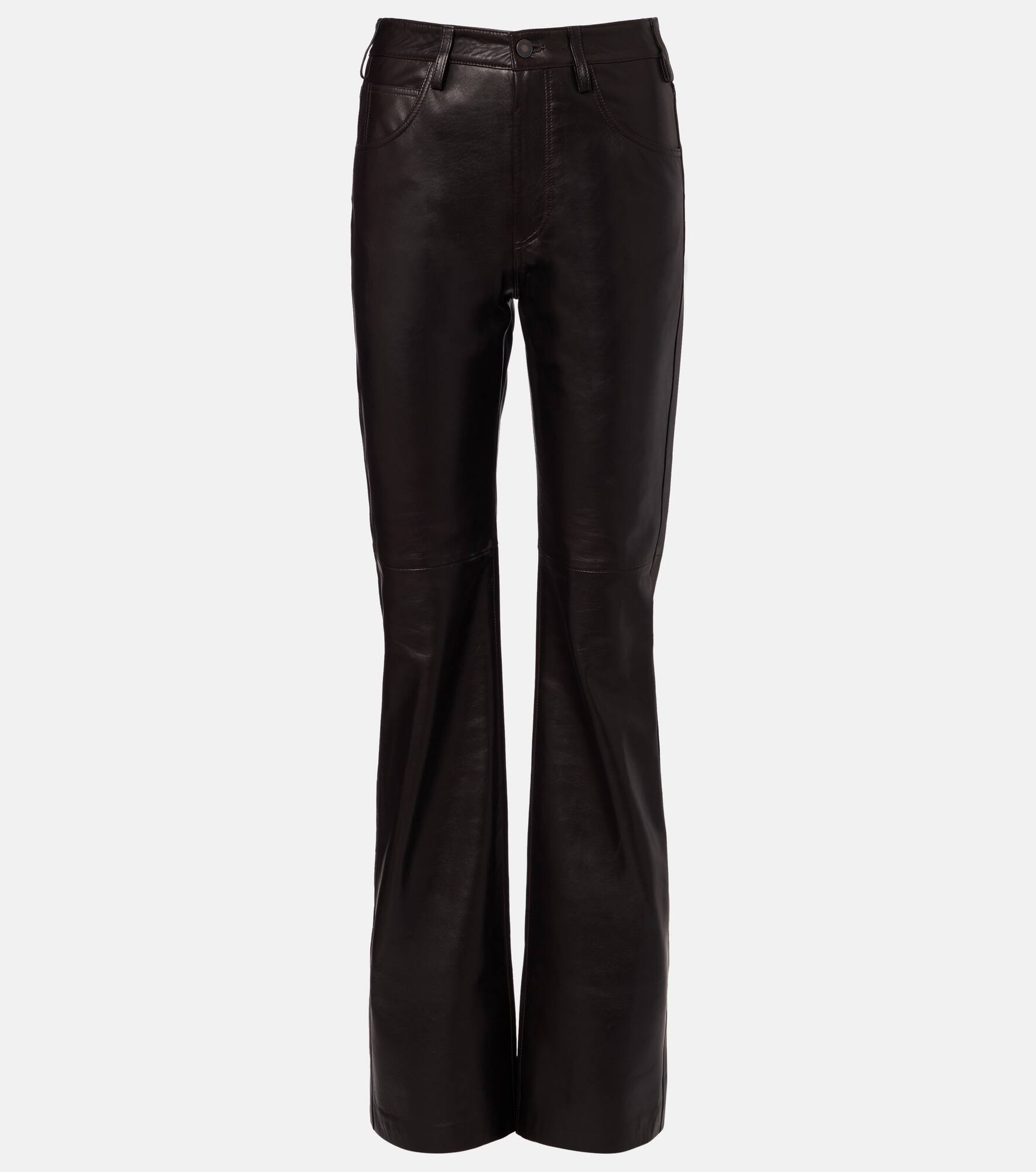 Invest in Nili Lotan's timeless wardrobe staples – where impeccable fit meets sophisticated tailoring. These bootcut pants are cut from lamb leather to a high-rise silhouette and create a vintage look. Product Details - Material: 100% lamb leather - Care instructions: specialist clean - Made in Turkey - Designer color name: Espresso - Item color: black - Lining: 97% polyester, 3% elastane - Closure: zipper fly, button fastening - Pockets: five pockets - Belt loops - Item number: P01114082 Size & Fit - Fits small to size - we recommend trying one size larger - Non-stretchy fabric - Straight leg - High-waisted - Height of model is 174cm-68.5" and wears a size US 6