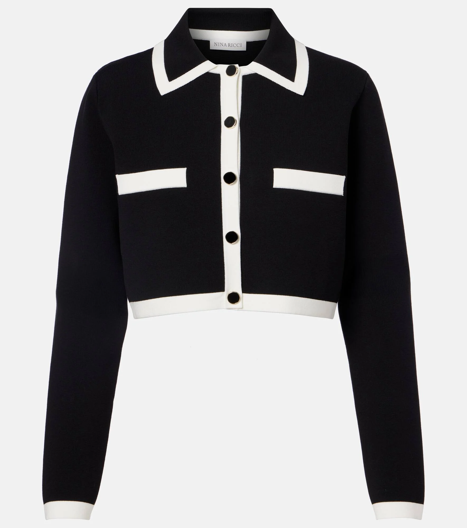 A skillful play of structure and proportion ensures the house of Nina Ricci remains a tastemaker for Parisian style. This cardigan features contrast trims and is cut to a cropped silhouette. Product Details - Material: 45% cotton, 37% viscose, 16% polyamide, 2% elastane - Care instructions: machine wash at 30 degrees - Made in China - Color: black - Designer color name: Ecru / Noir - Hardware color: black, silver - Pockets: faux pockets - Closure: buttoned front - Item number: P01141961 Size & Fit - True to size - Straight fit - Stretchy fabric - Cropped - The model seen in the picture is 178cm-5'10" and wearing a size XS
