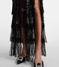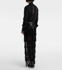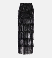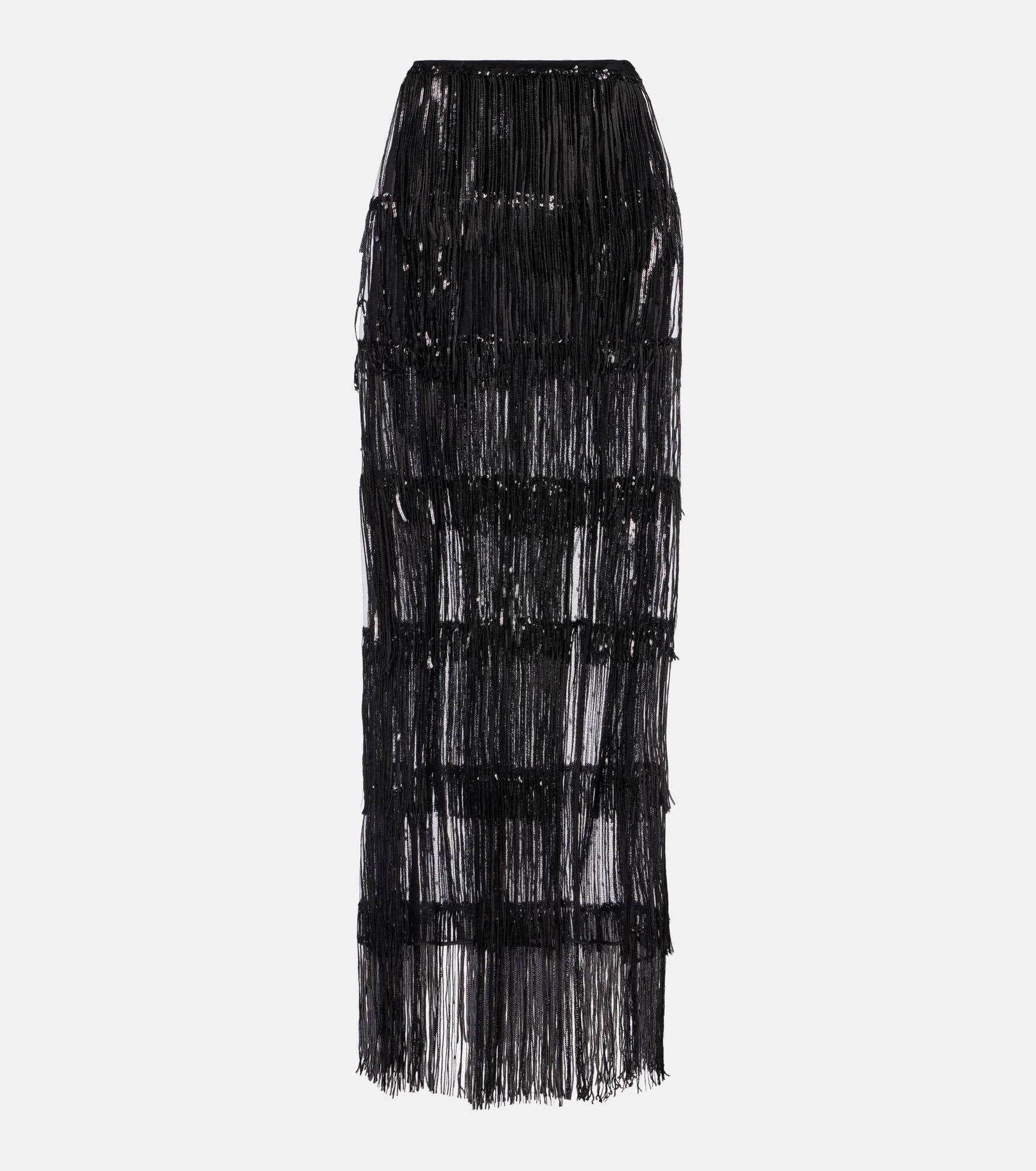 A skillful play of structure and proportion ensures the house of Nina Ricci remains a tastemaker for Parisian style. This show-stopping maxi skirt is cut from sheer tulle and finished with sparkling sequin fringes. Product Details - Material: 100% polyester - Care instructions: dry clean - Made in Poland - Designer color name: Black - Item color: black - Material II: 100% polyamide - Material III: 100% silk - Lining: 100% cupro - Closure: concealed zipped back - Long vent - Item number: P01069372 Size & Fit - True to size - Non-stretchy fabric - slit length 62cm-24.5" - The model seen in the picture is 178cm-5'10" and wearing a size FR 36