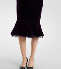 A skillful play of structure and proportion ensures the house of Nina Ricci remains a tastemaker for Parisian style. This midi skirt is made from soft cotton velvet and features a peplum silhouette finished with a tulle ruffled trim. Product Details - Material: 100% cotton - Care instructions: dry clean - Made in Bulgaria - Designer color name: Purple - Item color: purple - Material II: 100% polyamide - Lining: 100% viscose - Closure: zipped side - Item number: P01069367 Size & Fit - True to size - Non-stretchy fabric - The model seen in the picture is 178cm-5'10" and wearing a size FR 36