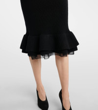 A skillful play of structure and proportion ensures the house of Nina Ricci remains a tastemaker for Parisian style. This midi skirt is made from a soft wool blend and features a peplum silhouette finished with a tulle ruffled trim. Product Details - Material: 97% wool, 2% polyamide, 1% elastane - Care instructions: hand wash - Made in China - Designer color name: Black - Item color: black - Material II: 100% silk - Elasticated waistband - Item number: P01069409 Size & Fit - True to size - Stretchy fabric - The model seen in the picture is 178cm-5'10" and wearing a size XS