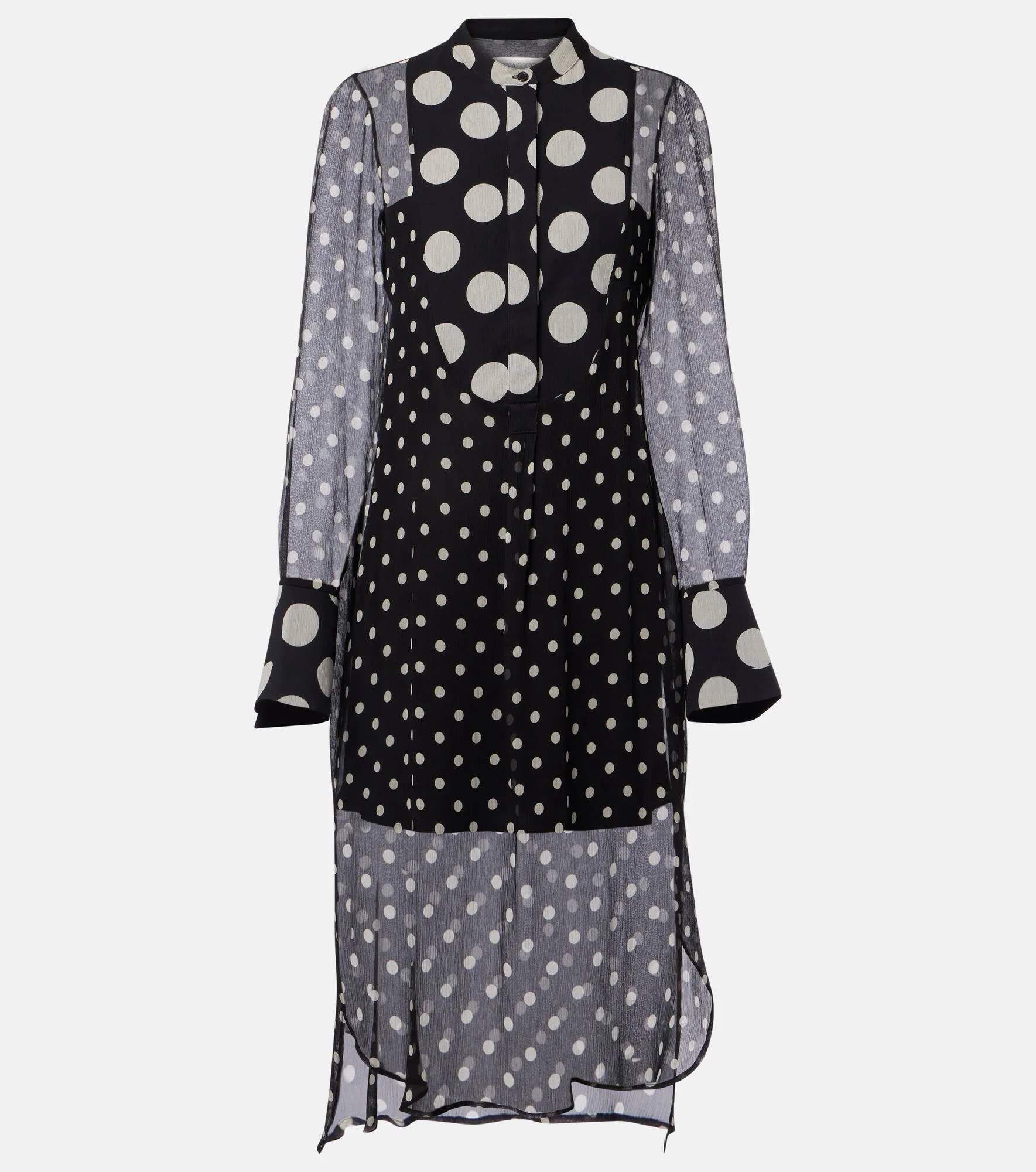 A skillful play of structure and proportion ensures the house of Nina Ricci remains a tastemaker for Parisian style. This midi dress is made from pure silk to a semi-sheer design with polka dots. Product Details - Material: 100% silk - Care instructions: dry clean - Made in Poland - Color: black - Designer color name: Polka Dots - Lining: 100% cupro - Closure: partially buttoned front - Cuff: one button - Side slits - Item number: P01141674 Size & Fit - True to size - Designed for a loose fit - Please note: Slip dress is fitted - Non-stretchy fabric - The model seen in the picture is 178cm-5'10" and wearing a size FR 36