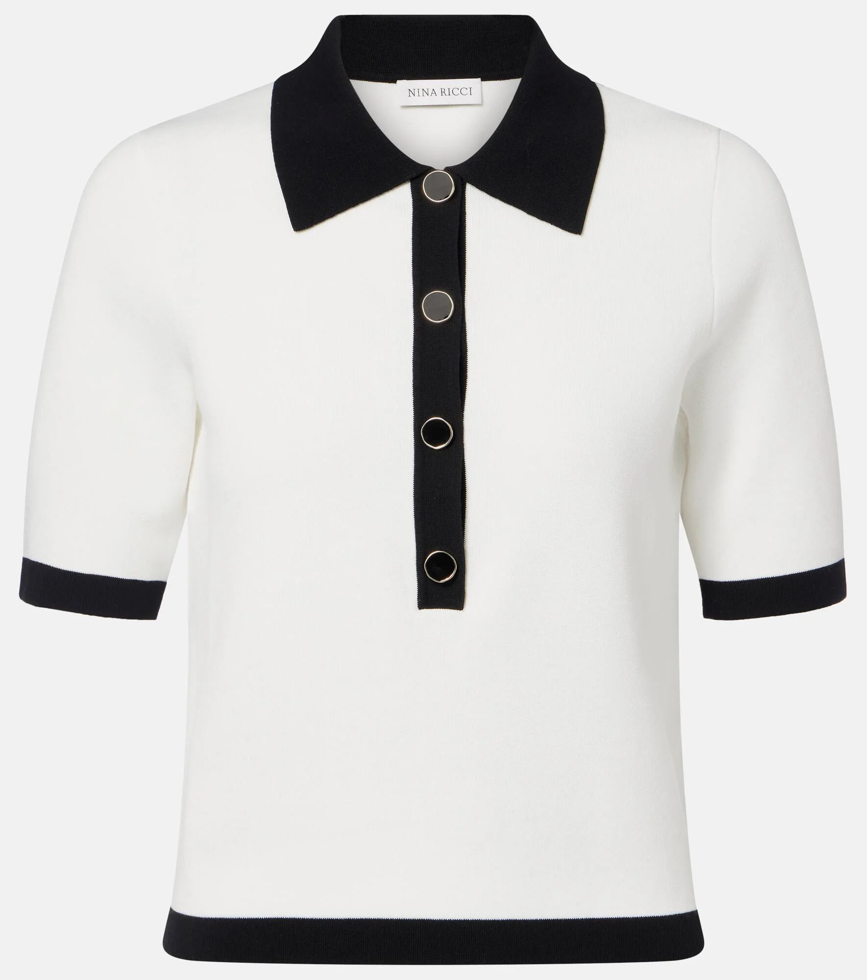 A skillful play of structure and proportion ensures the house of Nina Ricci remains a tastemaker for Parisian style. This polo shirt is made to a ribbed-knit design with contrast trims. Product Details - Material: 48% cotton, 40% viscose, 10% polyamide, 2% elastane - Care instructions: machine wash at 30 degrees - Made in China - Color: white - Designer color name: Noir Ecru - Collar: polo collar - Closure: partially buttoned front - Item number: P01141952 Size & Fit - True to size - Cinched waist - Stretchy fabric - Slightly cropped - The model seen in the picture is 178cm-5'10" and wearing a size XS