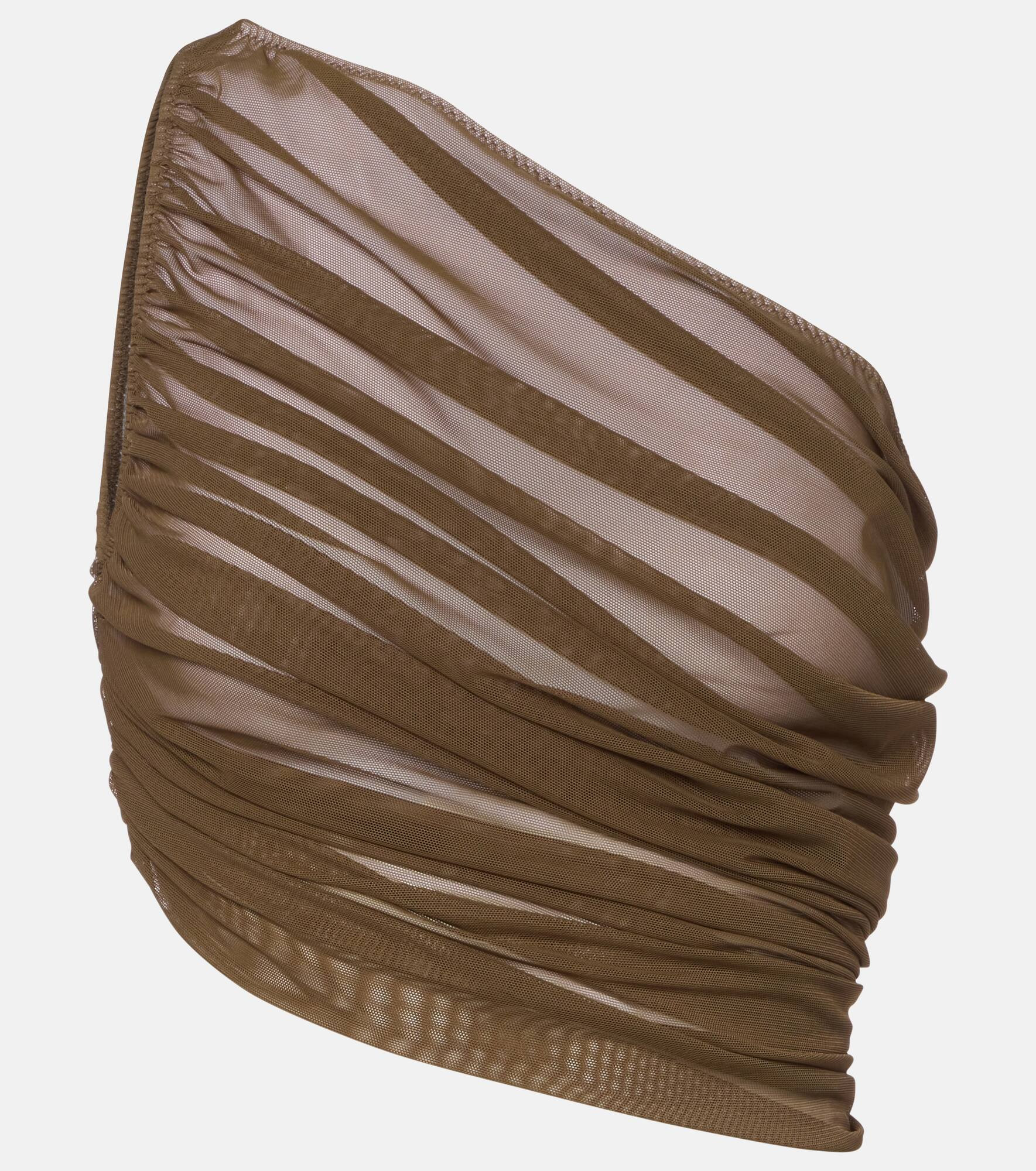 Norma Kamali’s signature ruched construction allows silhouettes to drape elegantly across the figure. This detail is showcased on the Diana crop top, complementing the one-shoulder cut and asymmetric hem. Product Details - Material: 82% nylon, 18% elastane - Care instructions: machine wash cold - Made in China - Designer color name: Bark - Item color: green - Lining: 95% polyester, 5% elastane - Elasticated waistband - Item number: P01098478 Size & Fit - True to size - Fitted - Slightly stretchy fabric - Cropped - The model seen in the picture is 178cm-5'10" and wearing a size XS