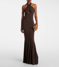 Award-winning designer Norma Kamali's playful approach to design has taken the world by storm since the 1960s. This gown boasts a halter neckline and a sweeping fishtail hem. Product Details - Material: 95% polyester, 5% elastane - Care instructions: machine wash cold - Made in China - Designer color name: Chocolate - Item color: brown - Item number: P01054089 Size & Fit - True to size - Low back - Fitted - Stretchy fabric - The model seen in the picture is 178cm-5'10" and wearing a size XS