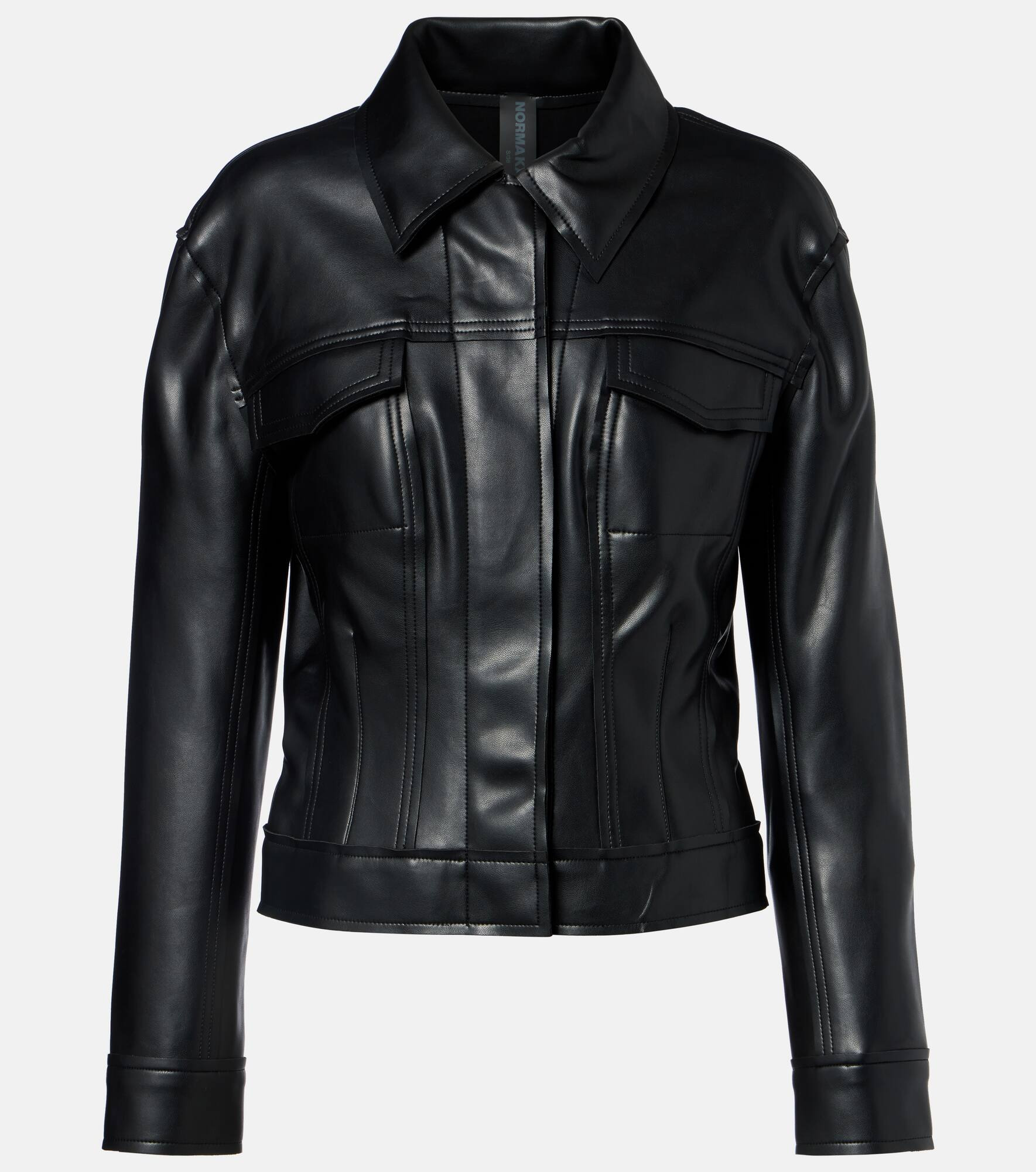 The Jeans jacket by Norma Kamali is a versatile staple that’s both stylish and effortlessly wearable. This style features a classic point collar, flap chest pockets, and a zip closure. Product Details - Material: 100% polyurethane - Care instructions: hand wash cold - Made in China - Designer color name: Black - Item color: black - Material II: 95% polyester, 5% elastane - Material III: 95% polyester, 5% elastane - Collar: classic (Straight point) - Pockets: flap chest pockets - Closure: concealed zipped front, VELCRO® fastenings - Item number: P01112344 Size & Fit - True to size - Cinched waist - Stretchy fabric - Falls to the hip - The model seen in the picture is 178cm-5'10" and wearing a size XS