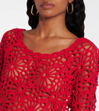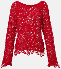 Award-winning designer Norma Kamali's playful approach to design has taken the world by storm since the 1960s. This cotton-blend sweater features an intricate floral open-knit design, complemented by a boat neckline, and scalloped hems. Product Details - Material: 90% cotton, 10% nylon - Care instructions: hand wash - Made in China - Designer color name: Tiger Red - Item color: red - Item number: P01063798 Size & Fit - True to size - Cinched waist - Non-stretchy fabric - Falls to the hip - The model seen in the picture is 178cm-5'10" and wearing a size XS