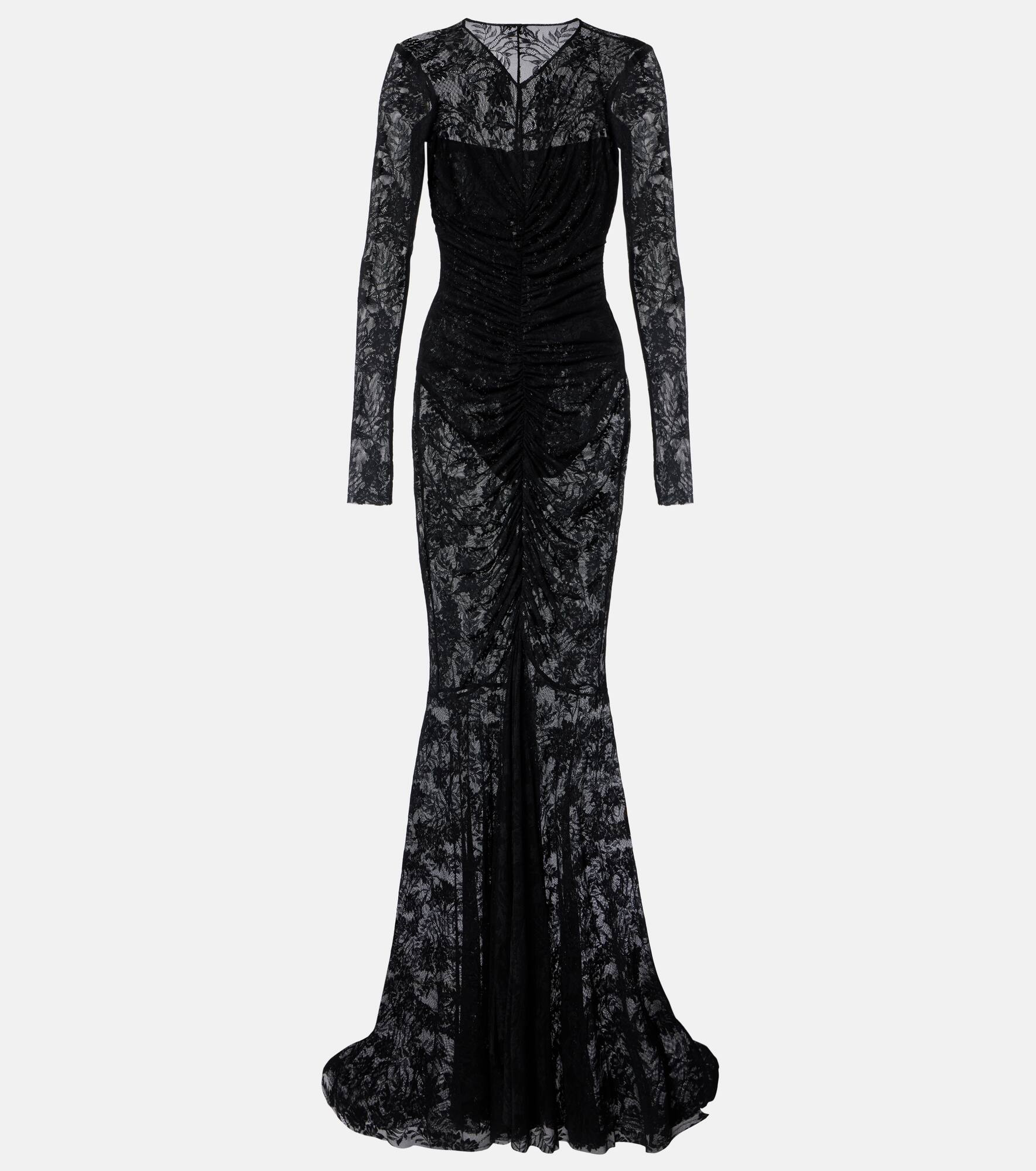 Norma Kamali’s signature ruched construction allows silhouettes to drape elegantly across the figure. A prime example, this lace gown features a fishtail hem, an alluring V-neckline, long sleeves, and comes with a bodysuit. Product Details - Material: 81% nylon, 19% elastane - Care instructions: machine wash cold - Made in China - Designer color name: Black - Item color: black - Two-piece set - Collar: V-neck - Sleeves: long-sleeved - Item number: P01112324 Size & Fit - True to size - Semi-sheer - Fitted - Stretchy fabric - Medium-cut leg - The model seen in the picture is 178cm-5'10" and wearing a size XS