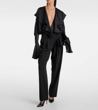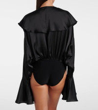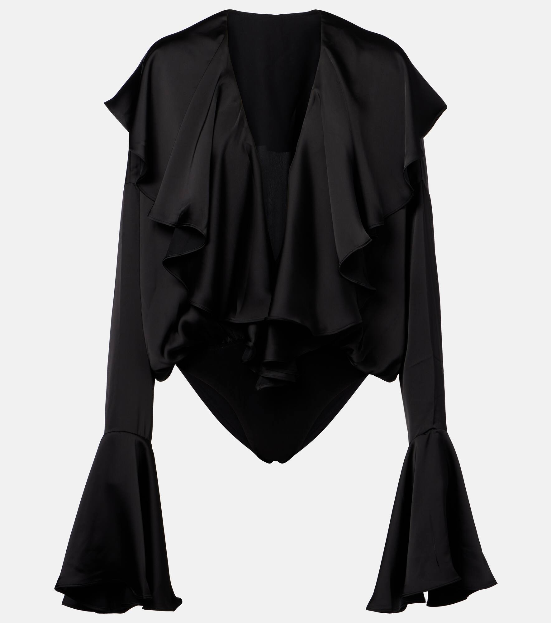 Crafted from 4-way stretch lycra, this bodysuit from Norma Kamali features a deep V-neckline with ruffle trimming at the neckline and sleeves. The charming design is complete with velcro and snap-buttoned closure. Product Details - Material: 100% polyester - Care instructions: hand wash - Made in China - Designer color name: Black - Item color: black - Material II: 95% polyester, 5% elastane - Closure: snap-buttoned fastenings - Elasticated waistband - Item number: P01063769 Size & Fit - True to size - Dropped shoulders - Elasticated waist - Oversized - Partly stretchy fabric - Medium-cut leg - The model seen in the picture is 178cm-5'10" and wearing a size XS
