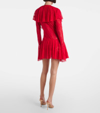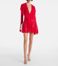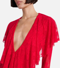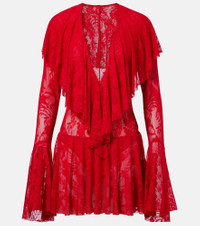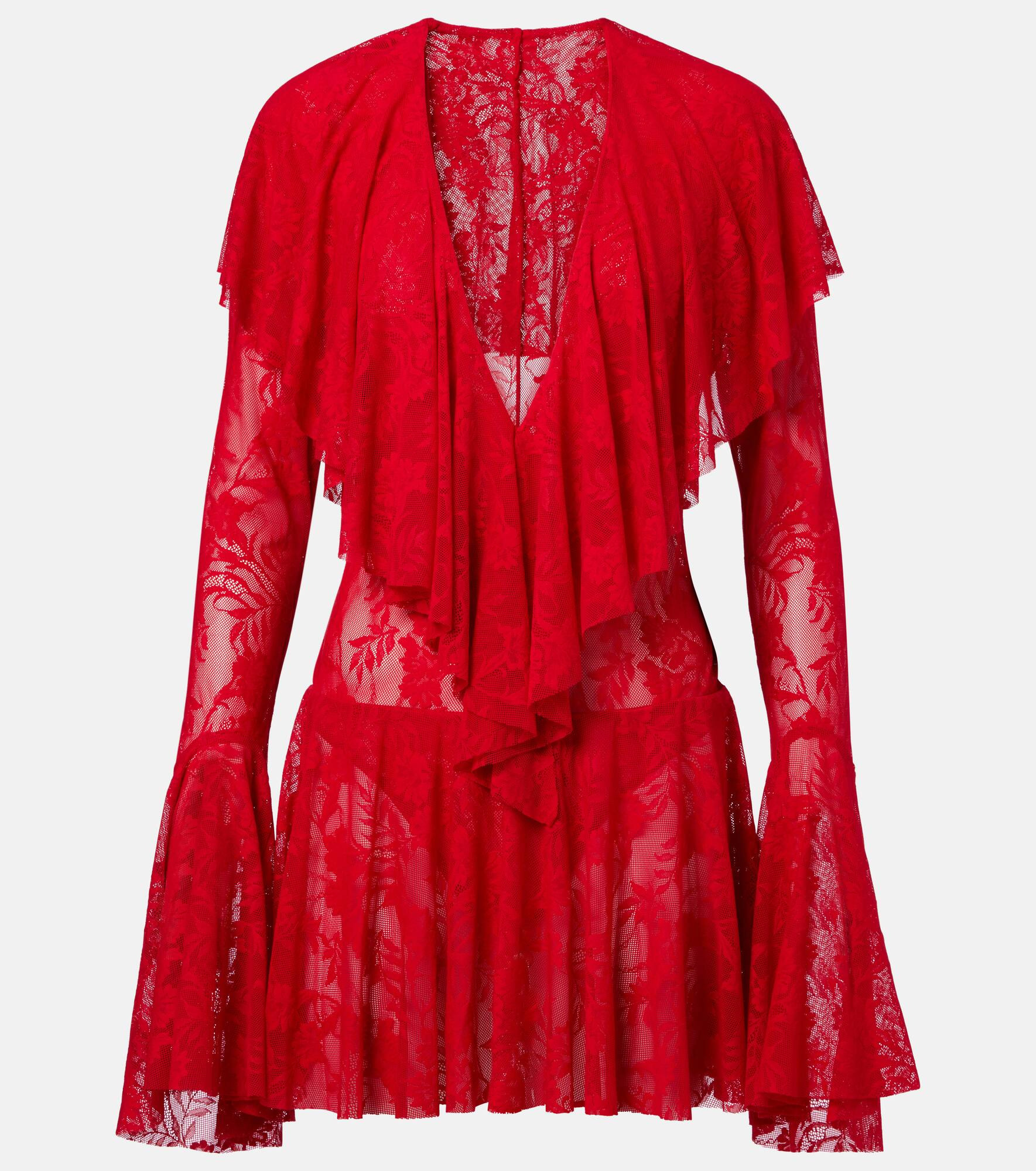 Award-winning designer Norma Kamali's playful approach to design has taken the world by storm since the 1960s. Crafted from lace, this semi-sheer minidress features a slim fit, romantic ruffled trims, and a flattering deep V-neckline. Product Details - Material: 81% nylon, 19% elastane - Care instructions: machine wash at 30 degrees - Made in China - Designer color name: Tiger Red - Item color: red - Item number: P01063777 Size & Fit - True to size - Semi-sheer - Cinched waist - Stretchy fabric - High-cut leg - The model seen in the picture is 178cm-5'10" and wearing a size XS