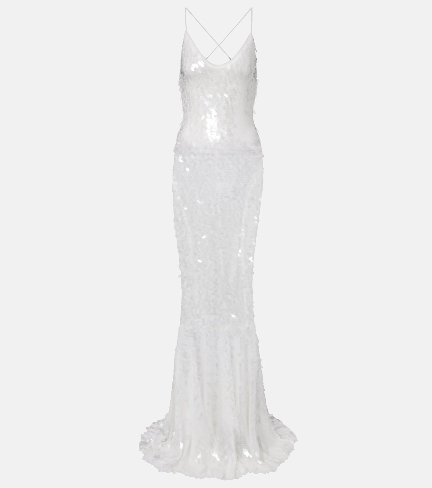 Award-winning designer Norma Kamali's playful approach to design has taken the world by storm since the 1960s. This gown showcases a sheath silhouette finished with shimmering embellishments, an open back with crossed straps, and a glamorous train. Product Details - Material: 88% nylon, 12% elastane - Care instructions: hand wash cold - Made in China - Designer color name: Crlear/White - Item color: white - Material II: 95% polyester, 5% elastane - Closure: self-ties - Item number: P01124214 Size & Fit - Fits small to size - we recommend trying one size larger - Low back - Semi-sheer - Fitted - Slightly stretchy fabric - Medium-cut leg - The model seen in the picture is 178cm-5'10" and wearing a size S