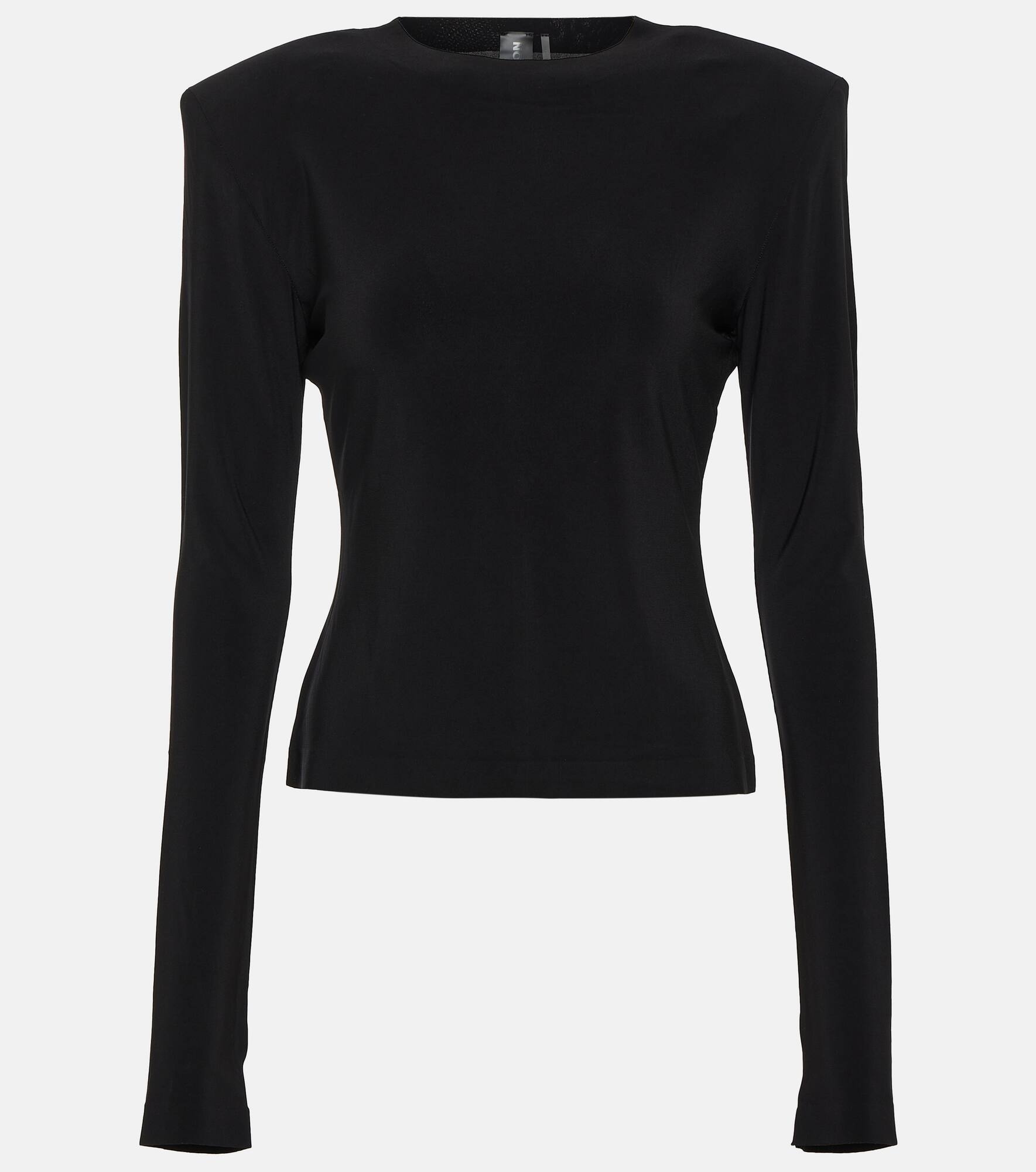 Equally versatile and polished, this top from Norma Kamali is made from the brand's four-way stretch Poly Lycra®. This style has long sleeves that loop around the hand, as well as padded shoulders for definition. Product Details - Made in China - Material: 5% elastane, 95% polyester - Care instructions: machine wash cold - Designer color name: Black - Item number: P00842183 Size & Fit - True to size - Oversized shoulders - Shoulder pad inserts - Fitted - Mid-weight material - Falls to the hip - The model seen in the picture is 178cm-5'10" and wearing a size XS
