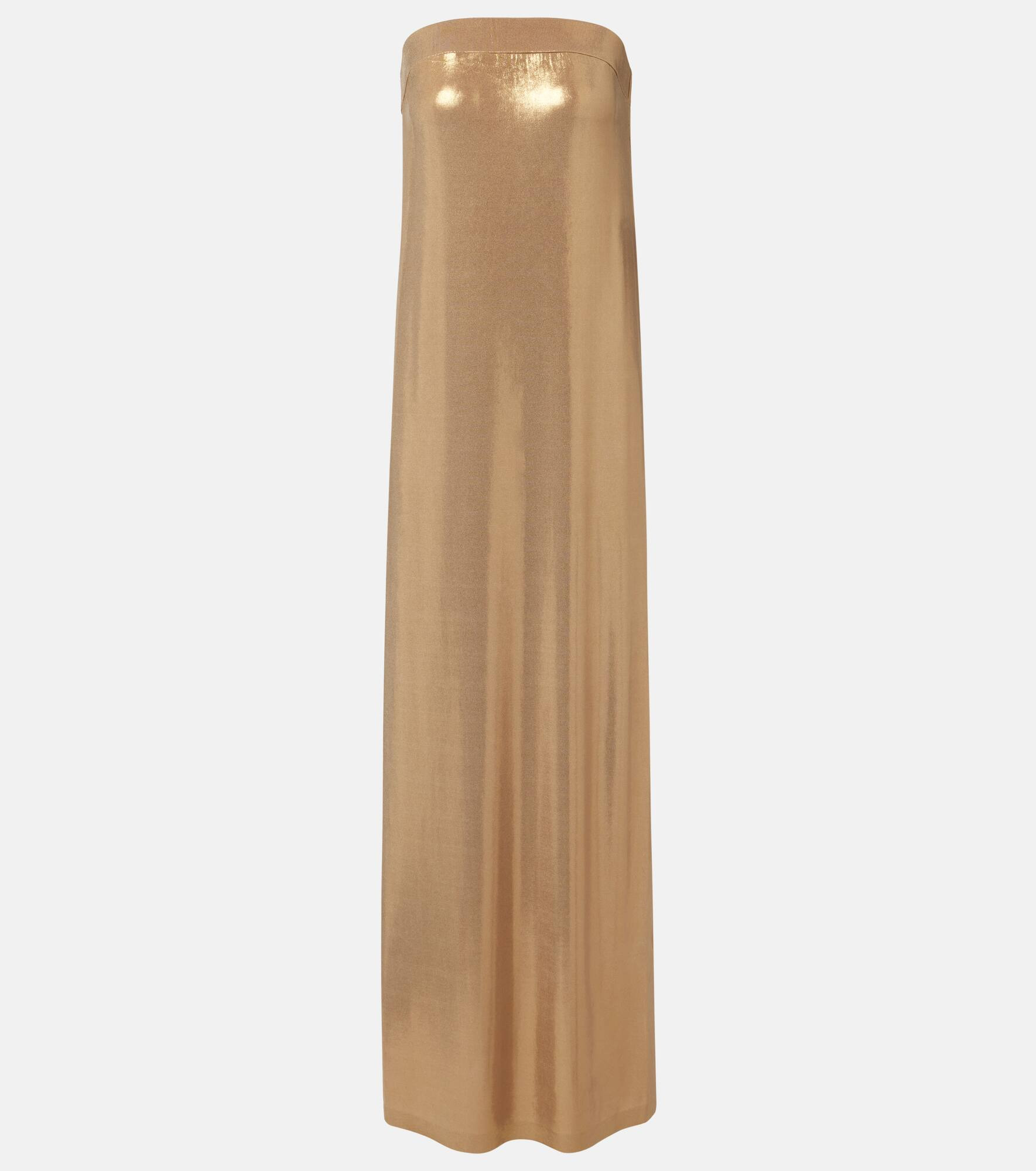 Award-winning designer Norma Kamali's playful approach to design has taken the world by storm since the 1960s. Made from gold-toned lame, this gown features a strapless neckline and floor-length silhouette. Product Details - Material: 95% polyester, 5% elastane - Care instructions: hand wash - Made in China - Designer color name: Gold - Item color: gold - Item number: P01063754 Size & Fit - True to size - Strapless - Elasticated top - Straight fit - Stretchy fabric - The model seen in the picture is 178cm-5'10" and wearing a size XS